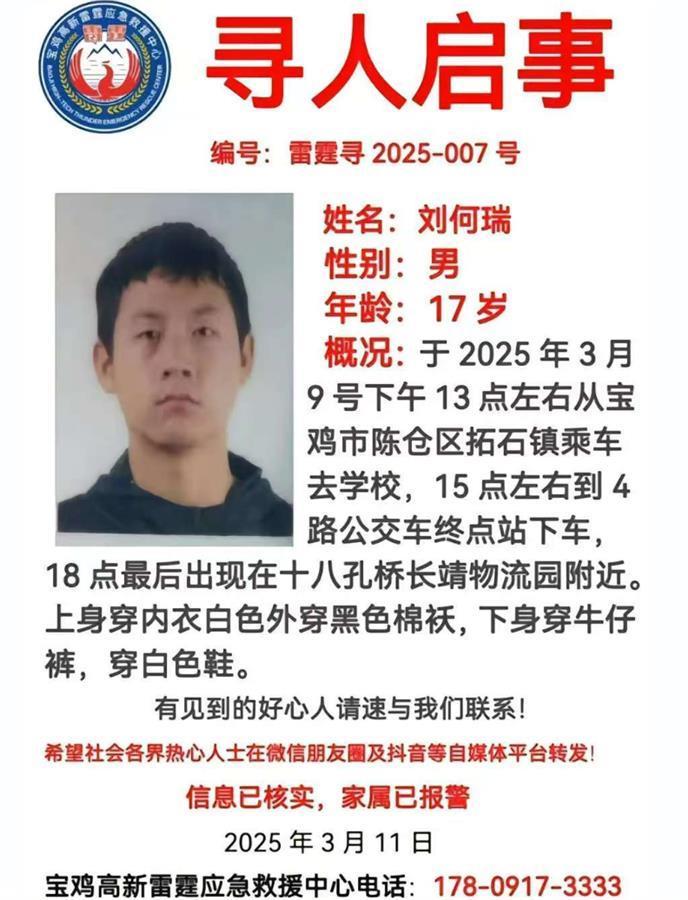 当地某救援队发布的寻人启事显示,2025年3月9日13时许,刘某某从宝鸡陈仓区拓石镇乘车去学校,15时许在4路公交车终点站下车,18时许最后出现在十八孔桥长靖物流园附近,上身穿黑色棉袄,下身穿牛仔裤,穿白色鞋。