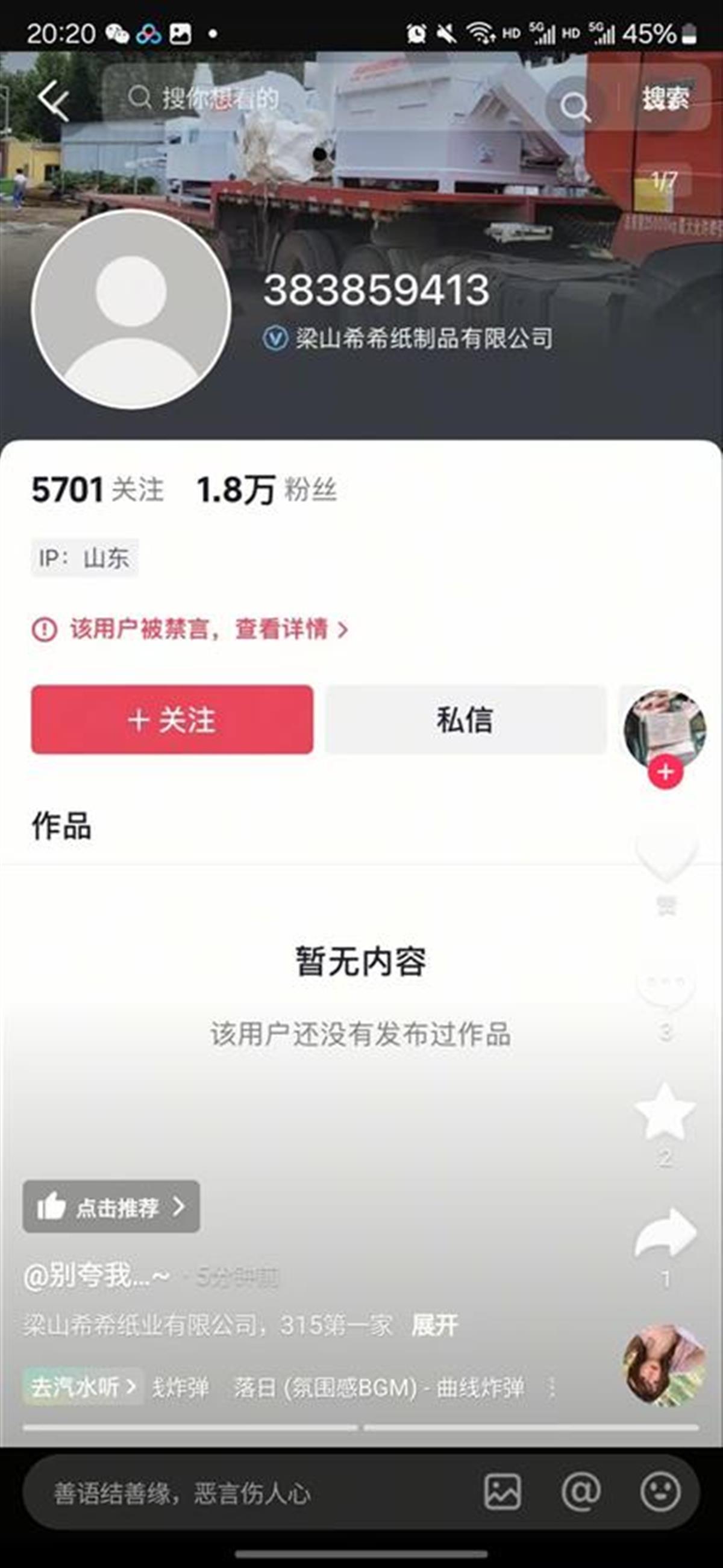 极目新闻记者注意到,该企业被曝光后,其抖音账号很快被禁言,显示“暂无内容”。