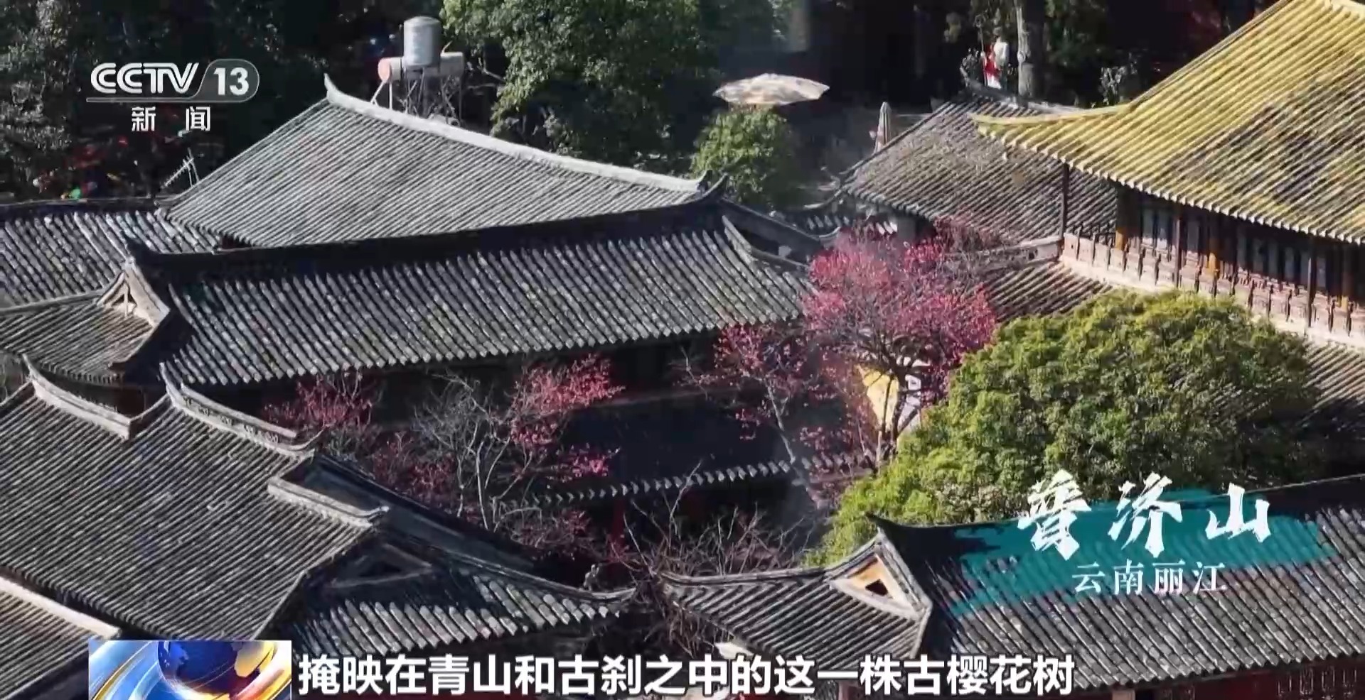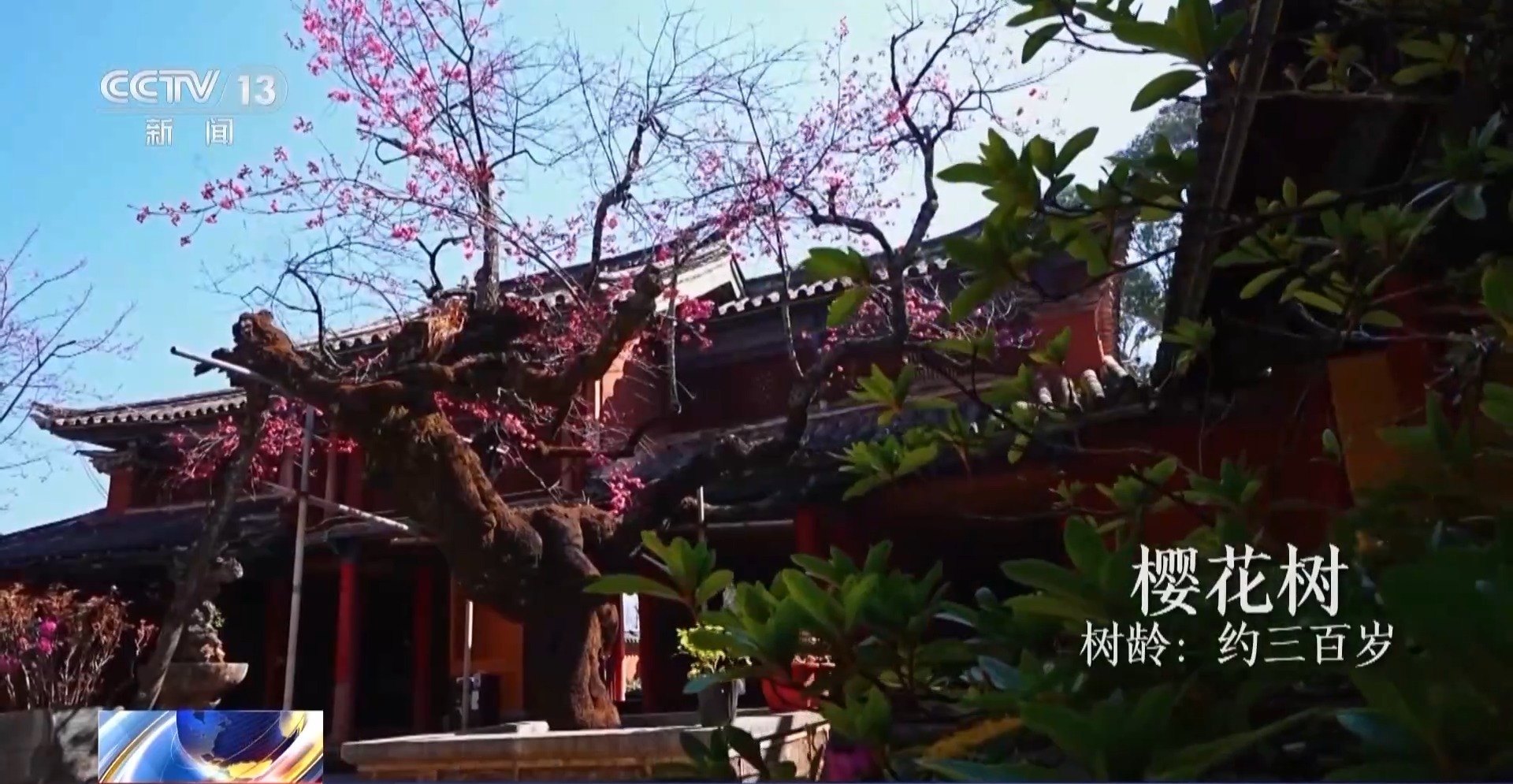 掩映在青山和古刹之中的这一株古樱花树,正如约绽放。