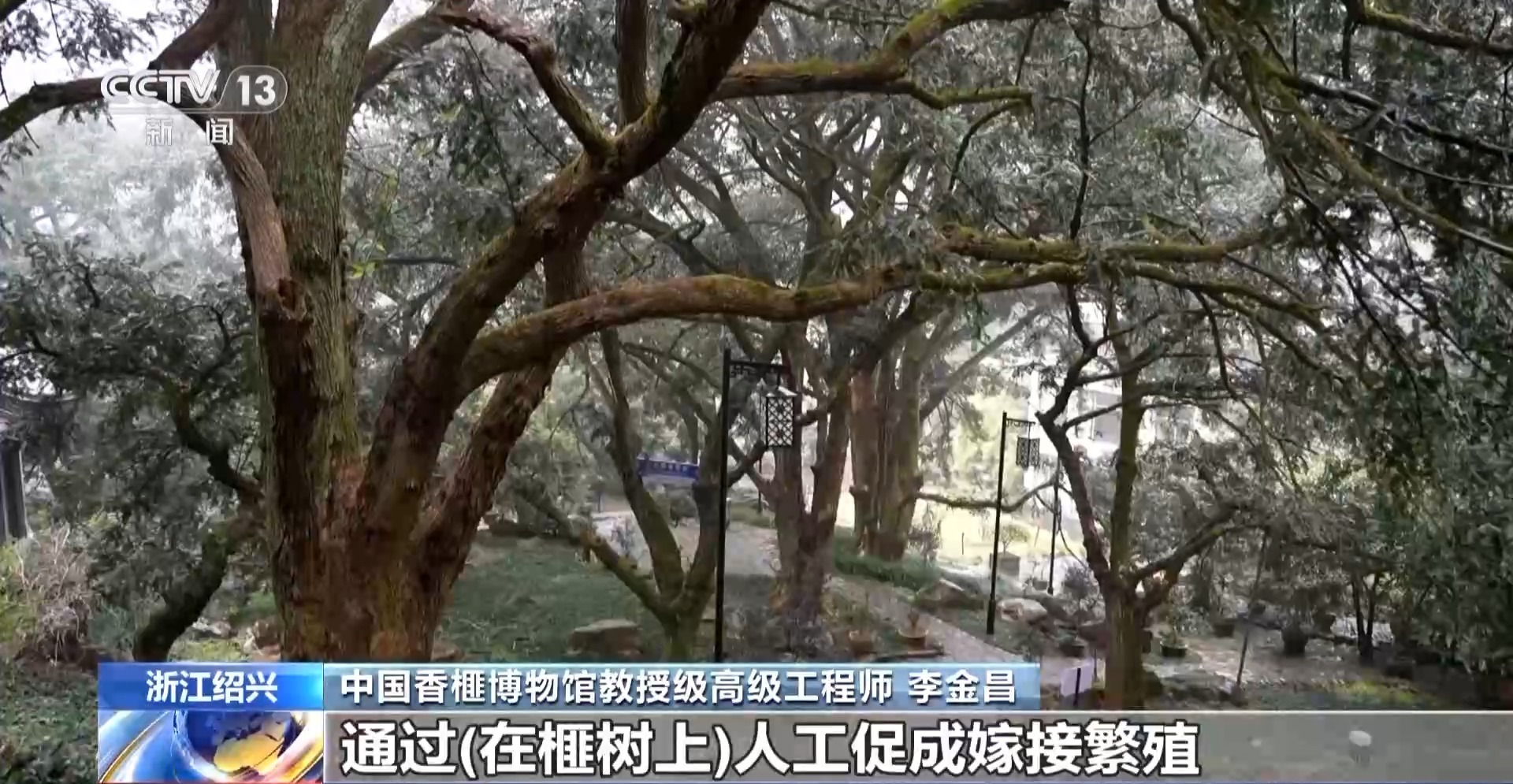 中国香榧博物馆教授级高级工程师 李金昌:香榧是会稽山先民发现了这么一个优良的野生资源。1500多年前通过在榧树上人工促成嫁接繁殖,世世代代传承,然后才拥有了这么一大片的古香榧林。保护这个古树,其实保护了当地整个农耕文明。