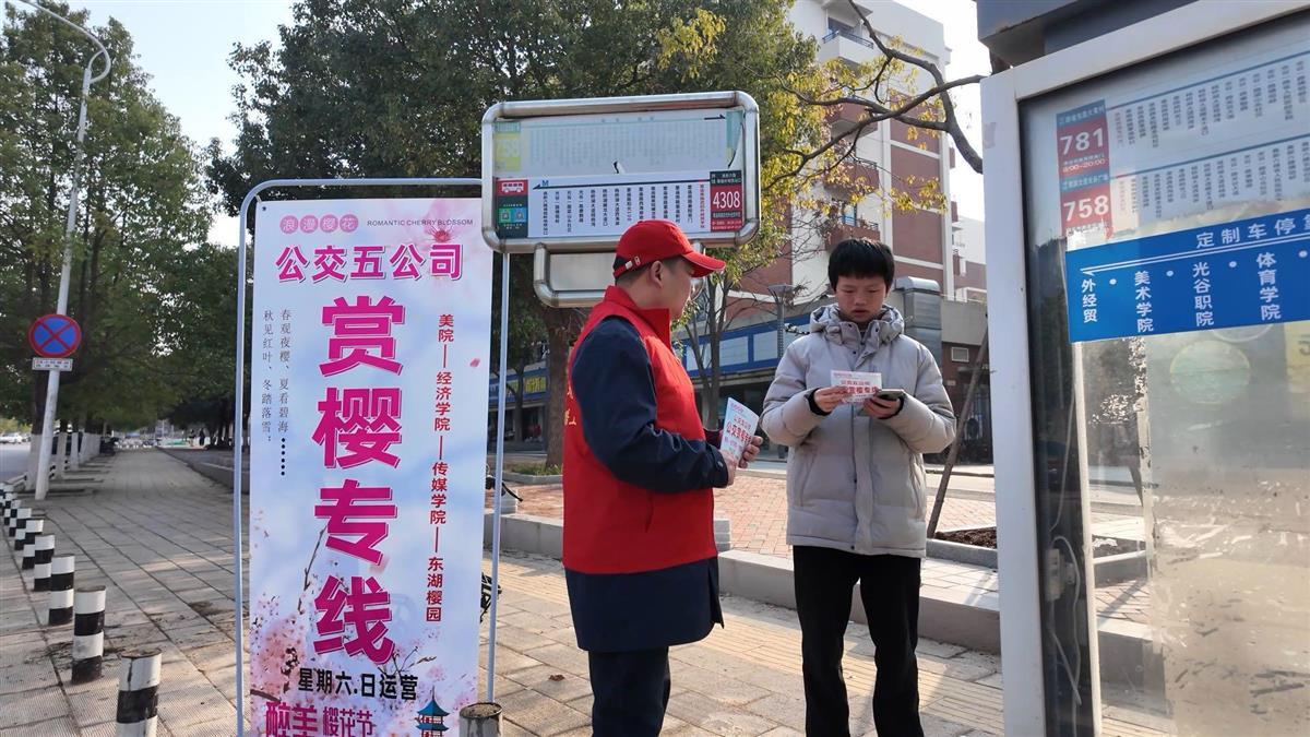 据负责赏樱专线8号线(D598路)运营的武汉公交集团五公司十三车队队长周天访介绍,在线路开通以前,车队就组织专人进行了实地调研和线路走向的规划,巧妙地将湖北美术学院、武汉纺织大学外经贸学院、武汉光谷职业学院、武汉外语外事职业学院、武汉体育科技学院、湖北城市建设职业技术学院、湖北经济学院、武汉工程大学流芳校区等8所高校串联起来。同时,通过组建微信群,和发放宣传单的方式,让大学生们提前知晓运营时间和运行线路,使他们能够轻松便捷地抵达东湖樱园赏樱,相约春天开启浪漫之旅。