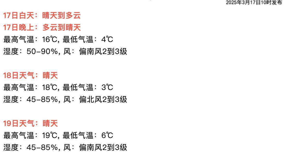 上周武汉市阴雨绵绵,阻挡了大家出游的脚步。昨天武汉市晴好天气回归。昨日武汉市多云间晴天,受冷空气南下影响,全市出现4到5级偏北风、阵风6到8级;昨日最低气温中心城区6℃~8℃、北部山区1℃~3℃、其他大部3℃~6℃,最高气温13℃~15℃。今日早晨武汉市晴天,最低气温中心城区4℃~6℃、北部山区-2℃~0℃、其他大部0℃~4℃。