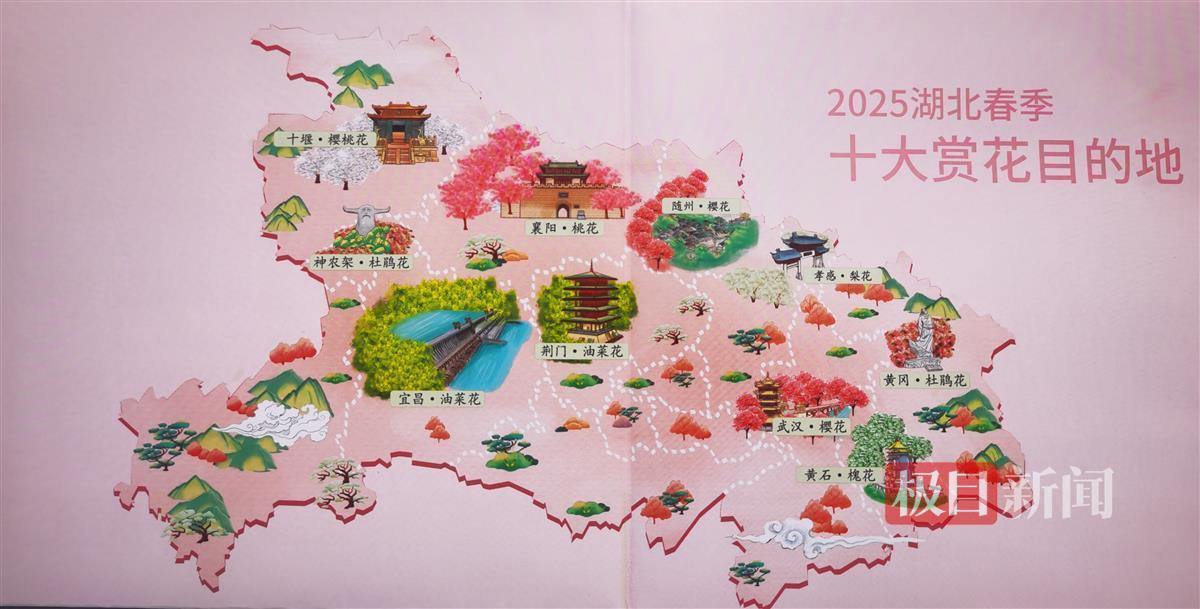 湖北省文化和旅游厅发布了2025湖北春季十大赏花目的地。武汉、随州的樱花,宜昌、荆门的油菜花,神农架、黄冈的杜鹃花,孝感的梨花,十堰的樱桃花,黄石的槐花,襄阳的桃花。从赏樱花到赏百花,知音湖北赏花游热度持续飙升,每天有20个以上的入境旅游团在省内赏花。