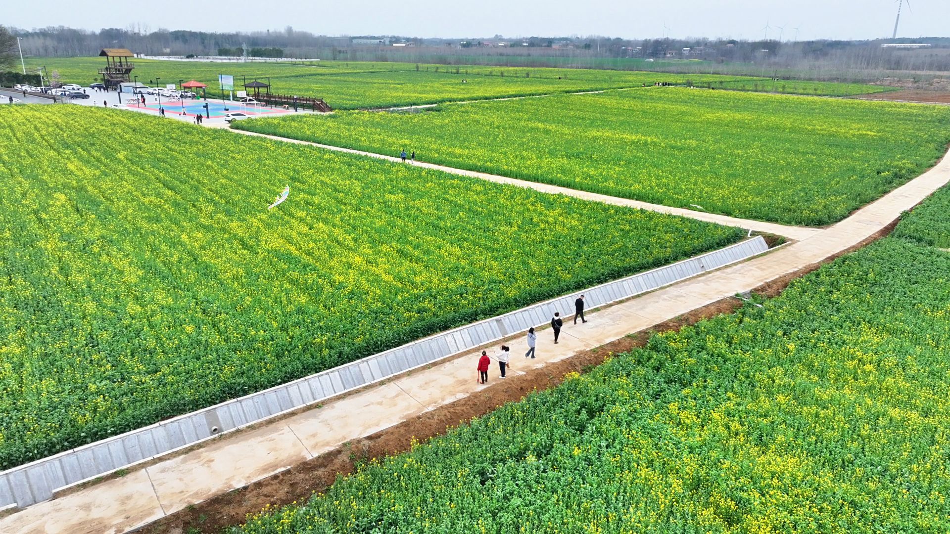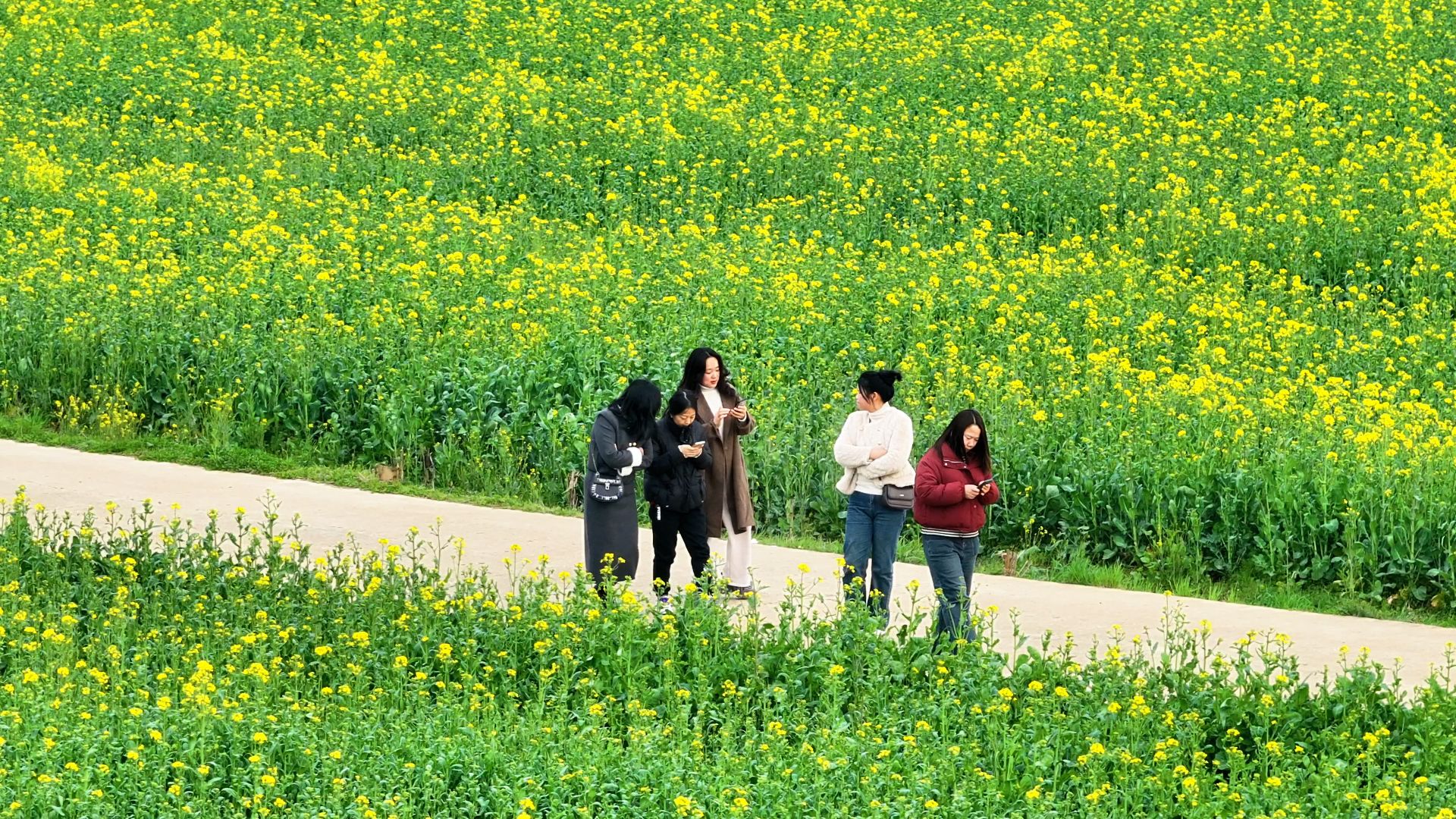 在魏河村油菜种植基地核心区,游客或登上木质观景台俯瞰花田,或在花径中拍照合影,欣赏油菜花海的无边胜景。