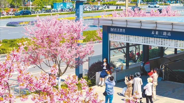 3月18日,武汉地铁11号线光谷未来三路站被盛开的樱花环绕,市民和游人纷纷来打卡。 (湖北日报全媒记者 魏铼 摄)
