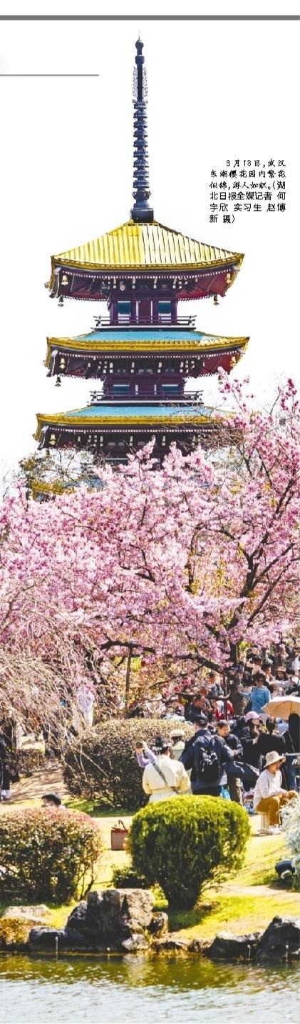 东湖樱花园内,古色古香的唐风建筑与樱花相映成趣。“能在武汉看樱花,对我来说是一个惊喜。过去只知道去日本看樱花,来了才发现武汉的樱花更多,颜色更丰富。”来自马来西亚的游客郑丽莲说,“今天到武汉东湖樱花园,是我们此次湖北旅行的最后一站。此前我们去了长江三峡、荆州古城,在湖北过了一个难忘的春天。”在湖北赏百花、尝特色美食、品非遗文化,荆楚大地正以花为媒,吸引四海宾朋尽情享受这场春日盛宴。