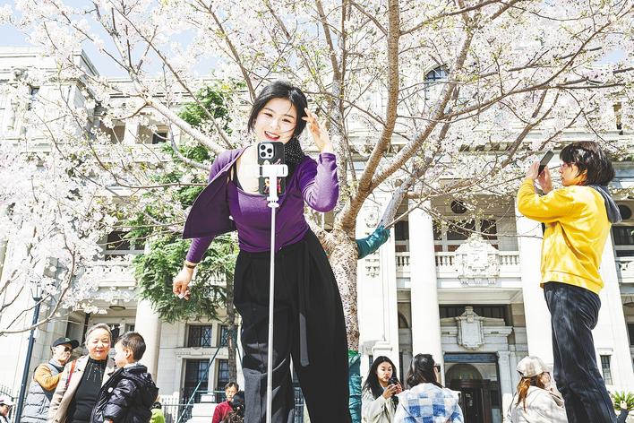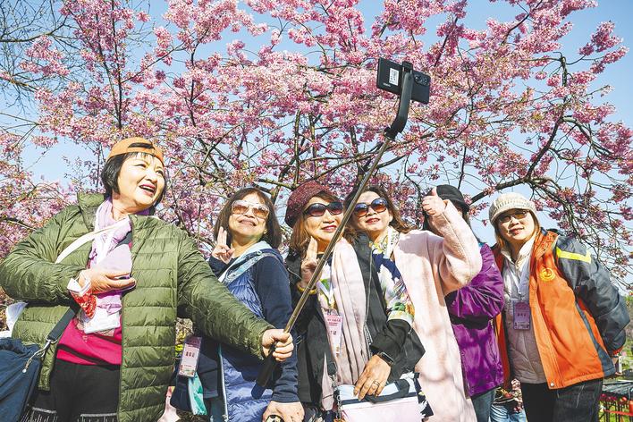 3月18日,来自台湾地区的旅游从业者在东湖樱花树下自拍留影。 (湖北日报全媒记者 任勇 摄)