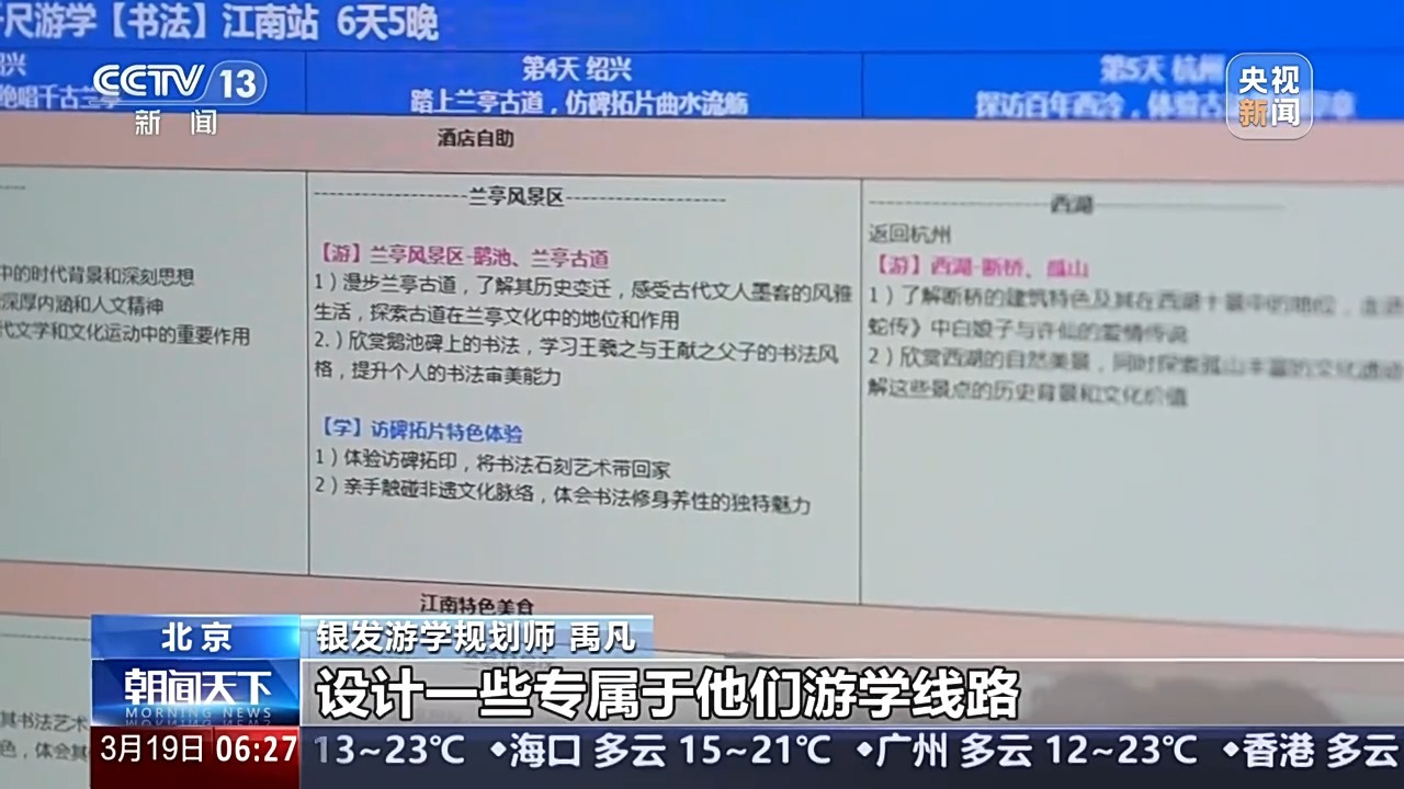 银发游学规划师 禹凡:根据老年人的一些特性,还有他们对于兴趣爱好的一些需求,像我们有钢琴,有养生,还有书法,设计一些专属于他们的游学线路。