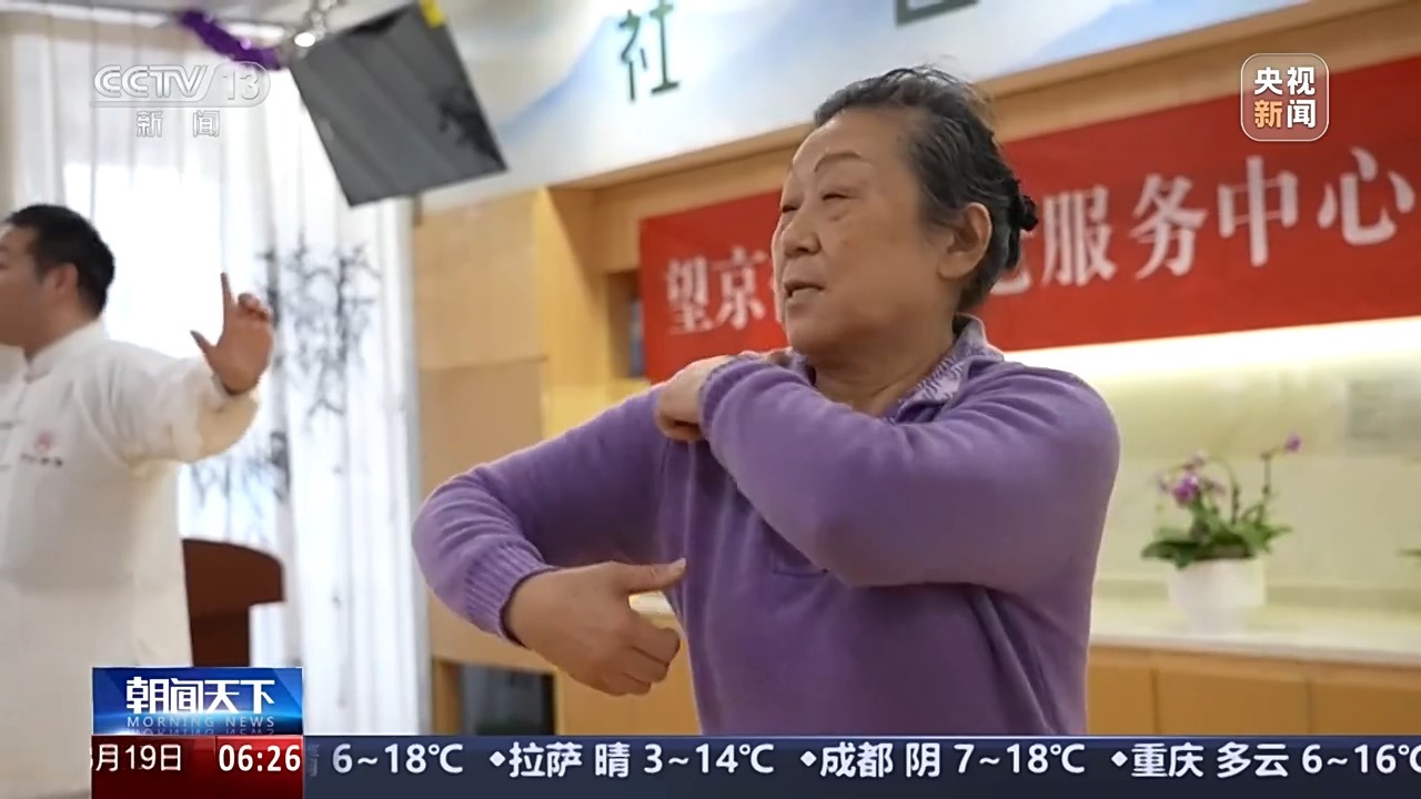 在北京朝阳区的另一家社区养老驿站,76岁的阎建敏老人也在教一些老年人练习八段锦。