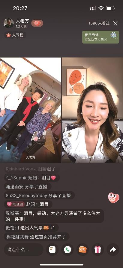方励与小红书博主“三多同学”直播连线,见证梁秀金女儿黄婉琼(左图中间)与英方亲属合影。手机截屏