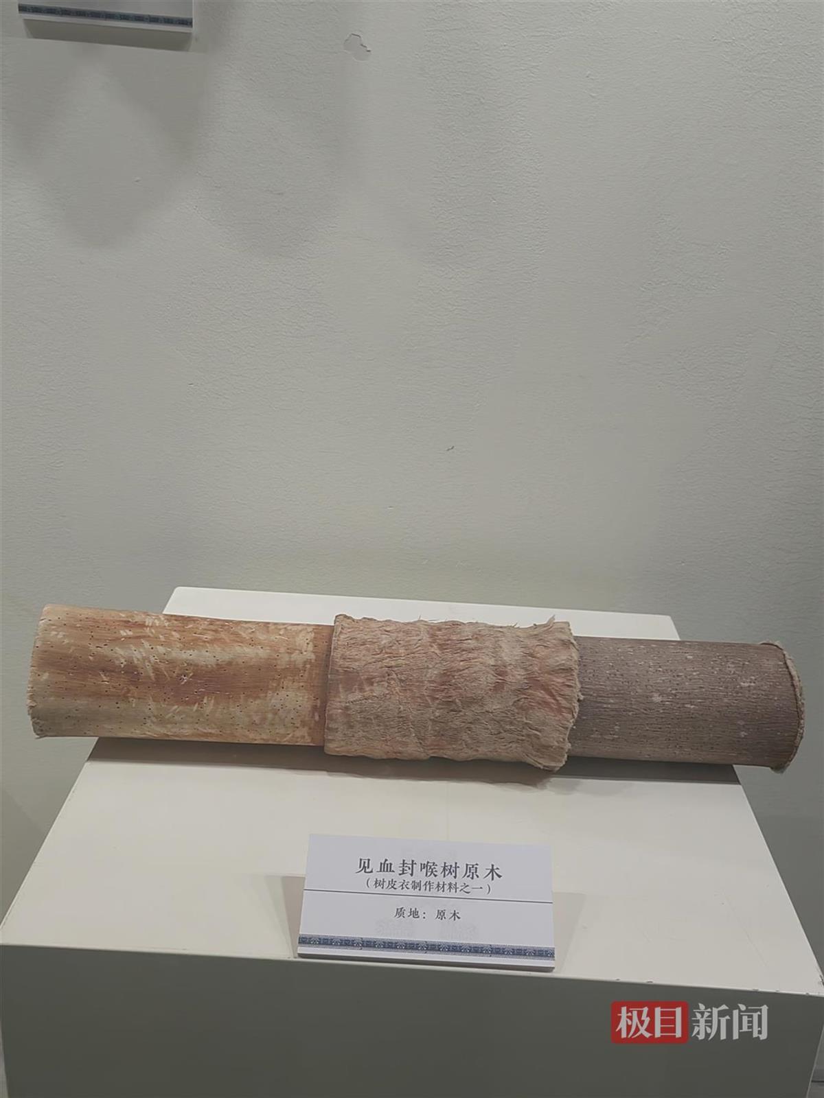 现场还展示了见血封喉树原木,这居然也是制作树皮衣的材料之一。王智麟解读说,见血封喉属物种的树皮破后流出的白色乳汁有毒,如果制作树皮衣的人手上有伤口,会危及生命,所以在制作的时候要特别小心。但经过这一系列制作工序后,制作而成的树皮衣是没有毒的。