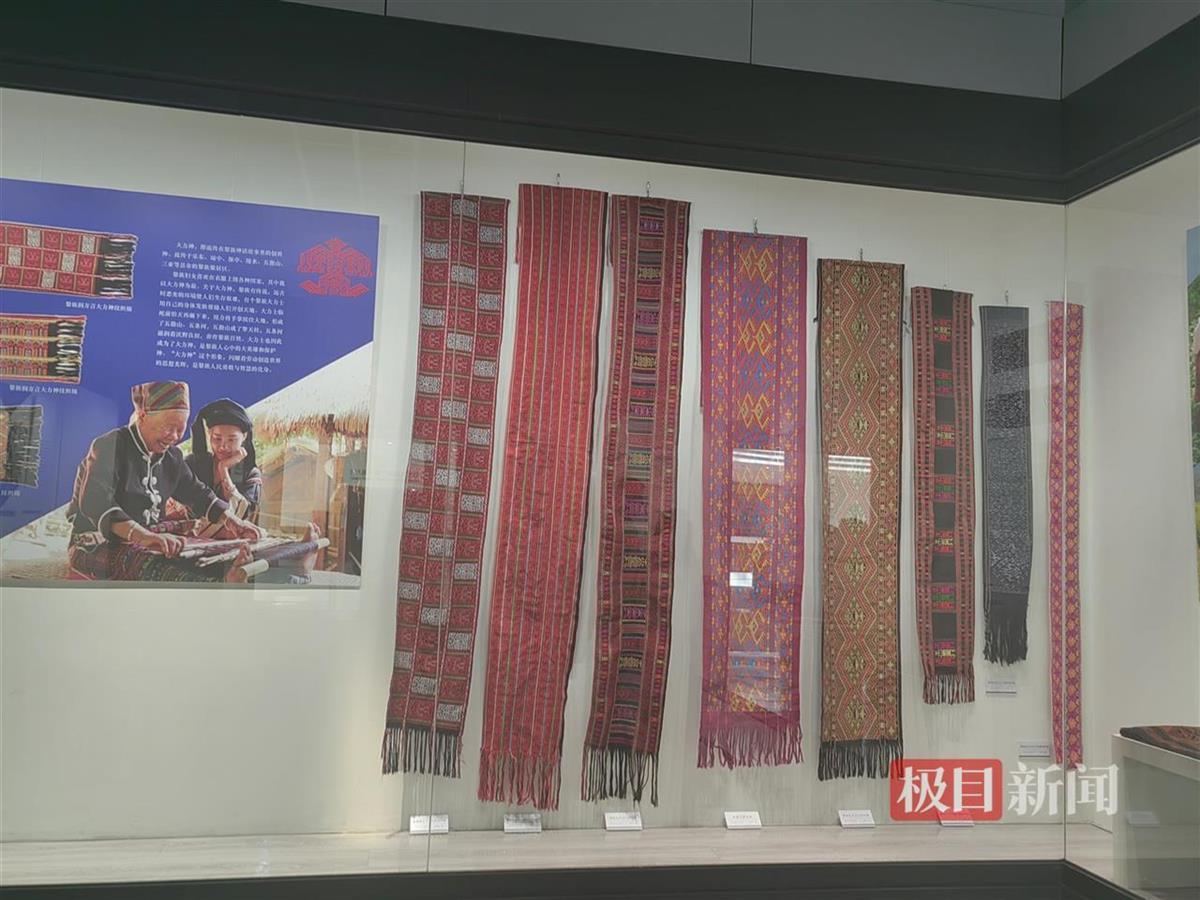 王智麟指着展厅里的一件244cm长、35cm宽的“黎族润方言大力神纹织锦”告诉极目新闻记者,当地主要在农闲时织锦,靠着老人的记忆一代代传承下来,这样的一块锦,当地老人可能要织九到十个月时间。