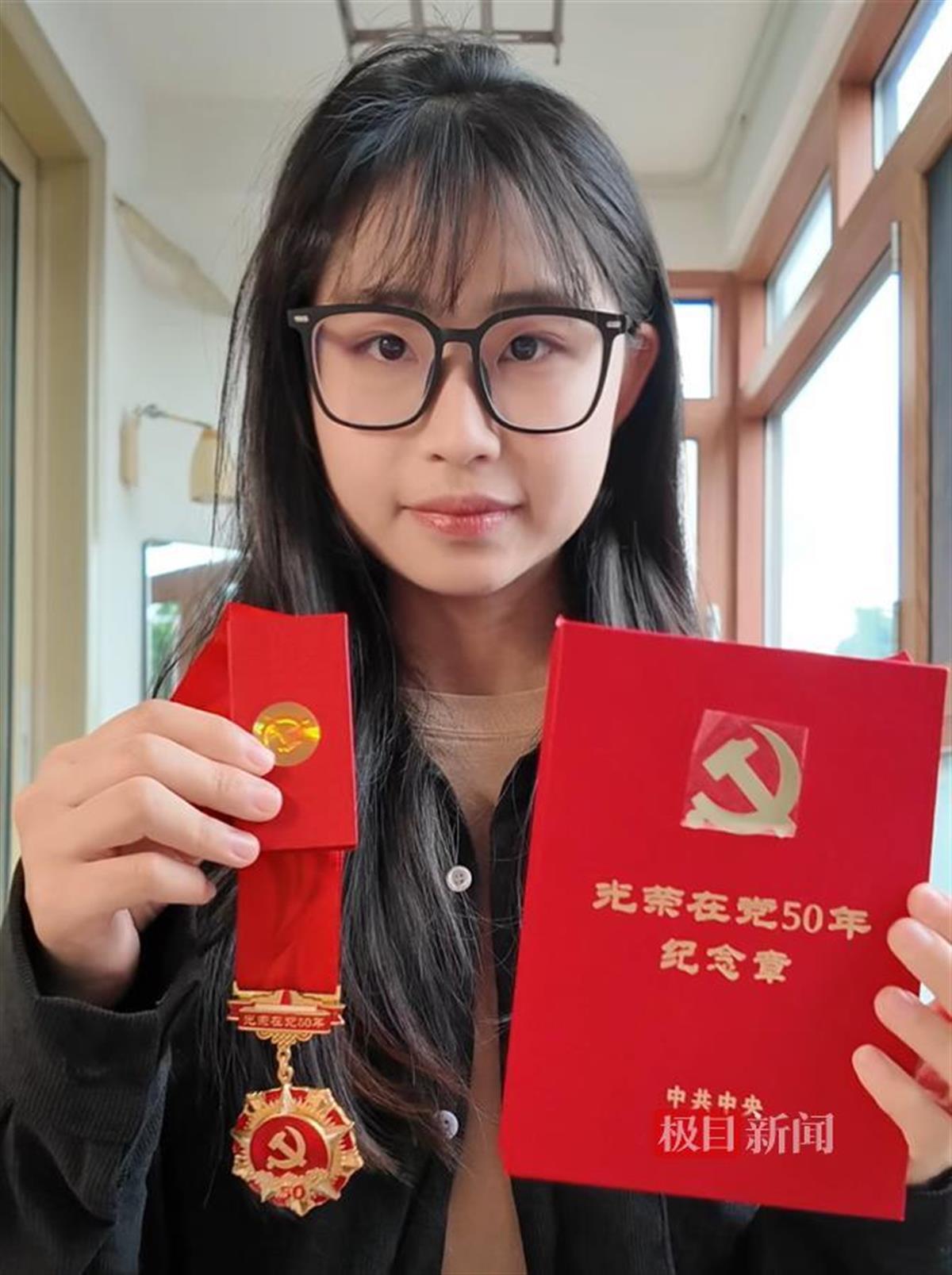 万雪婷拿着爷爷的“光荣在党50年”纪念章
