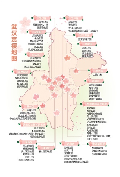 春光正好,快来感受武汉最美樱花季的满城芬芳!武汉市园林和林业局日前发布了2025年最新赏樱地图。据不完全统计,全市公园景区和道路共有赏樱点221处,其中,有百株以上樱花树的樱花林共有81处。