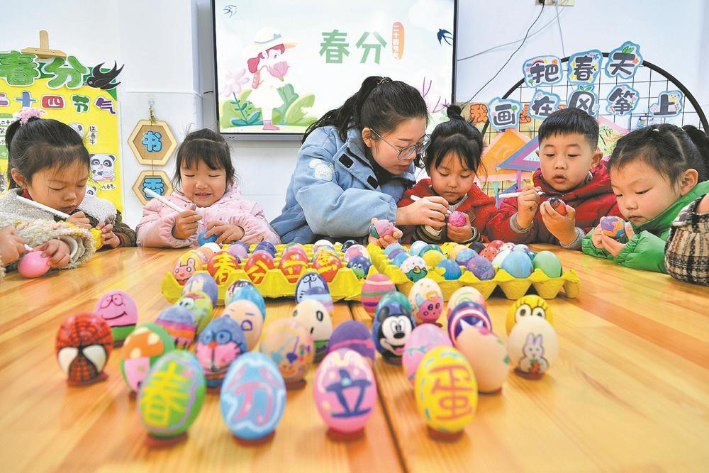 3月19日,在保康县县直机关第二幼儿园,老师指导小朋友绘制彩蛋。当天,该幼儿园开展“遇春分,知春意”主题活动,小朋友在老师的带领下体验绘彩蛋、玩立蛋游戏、手绘风筝等传统习俗,学习春分节气知识,感受中华传统文化的魅力。