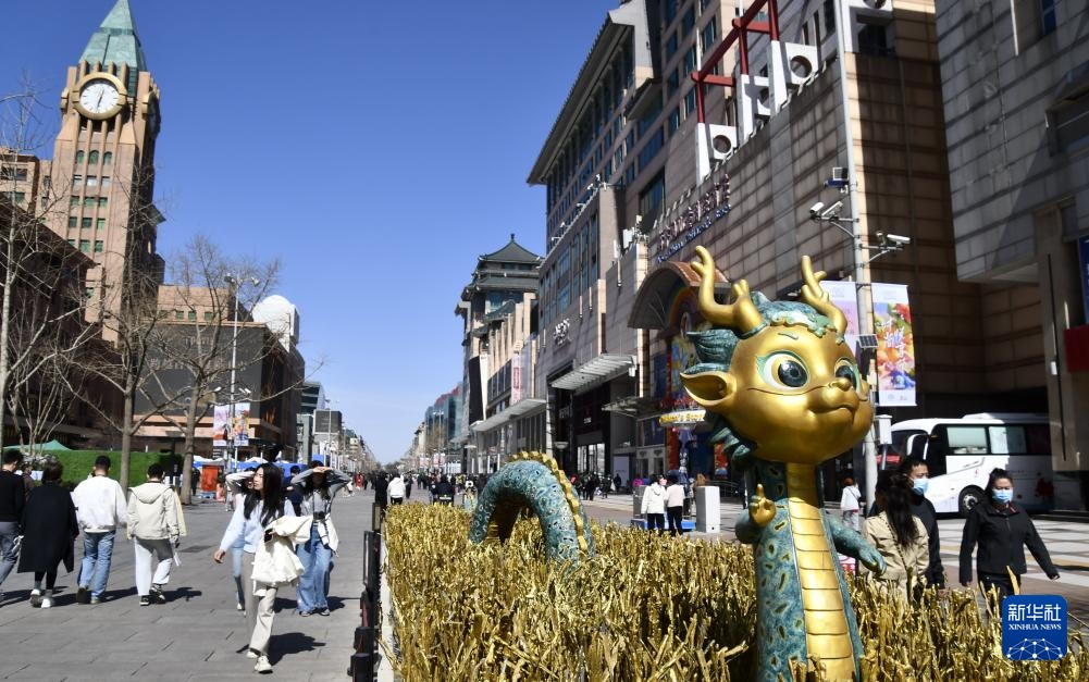 3月20日,人们从北京王府井商业街区的裸眼3D大屏前走过。