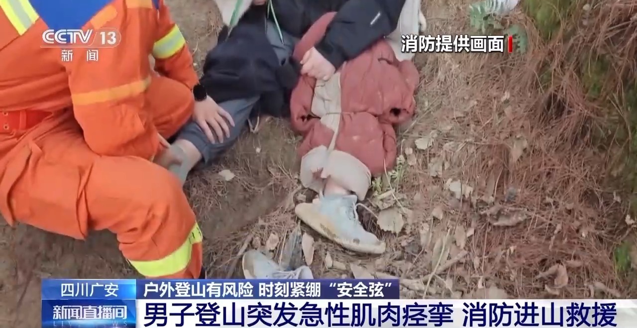 近日,一名男子和同伴在四川广安高兴镇登山游玩时,双腿突然抽筋,并且出现失温症状,丧失行动能力。因报警人无法确定受困者位置,消防员在报警人引导下徒步前往事发地。