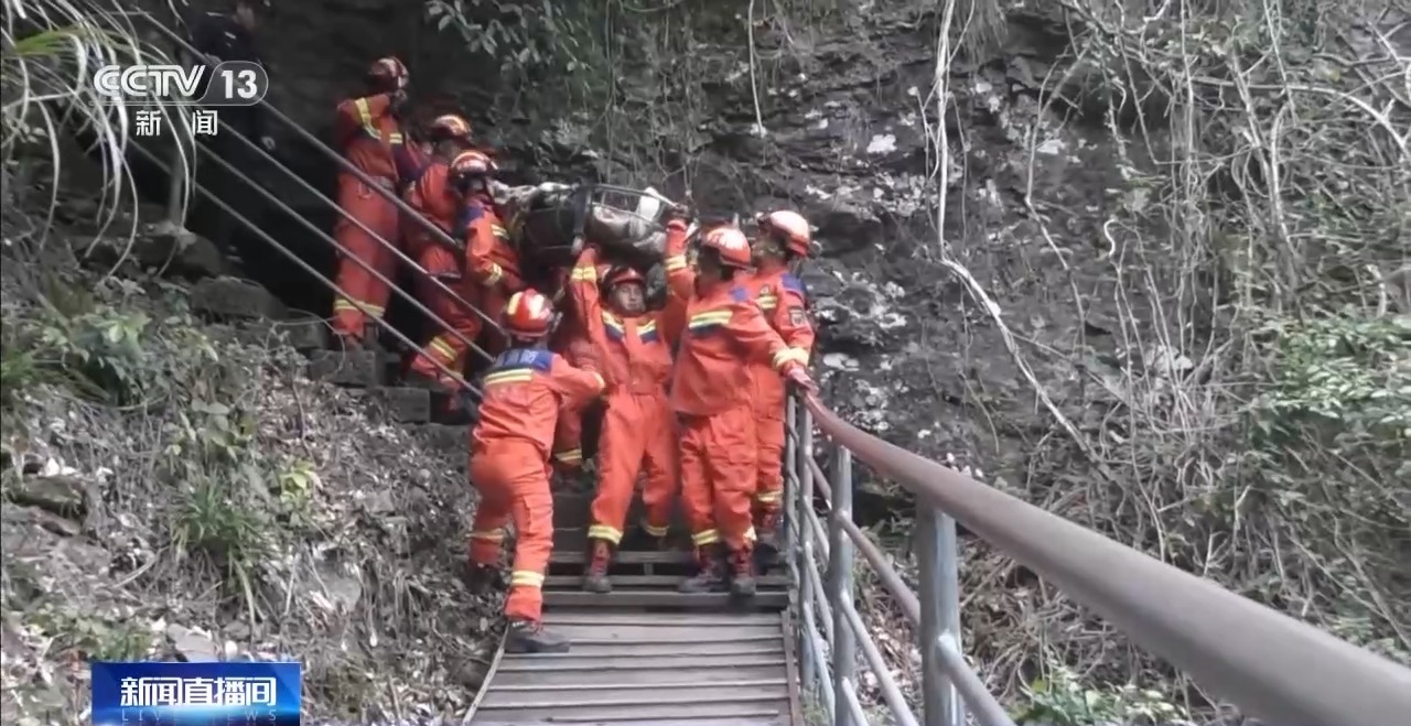 消防员与医护人员将受伤男子固定后,利用绳索和担架将其转移到山下,送医治疗。