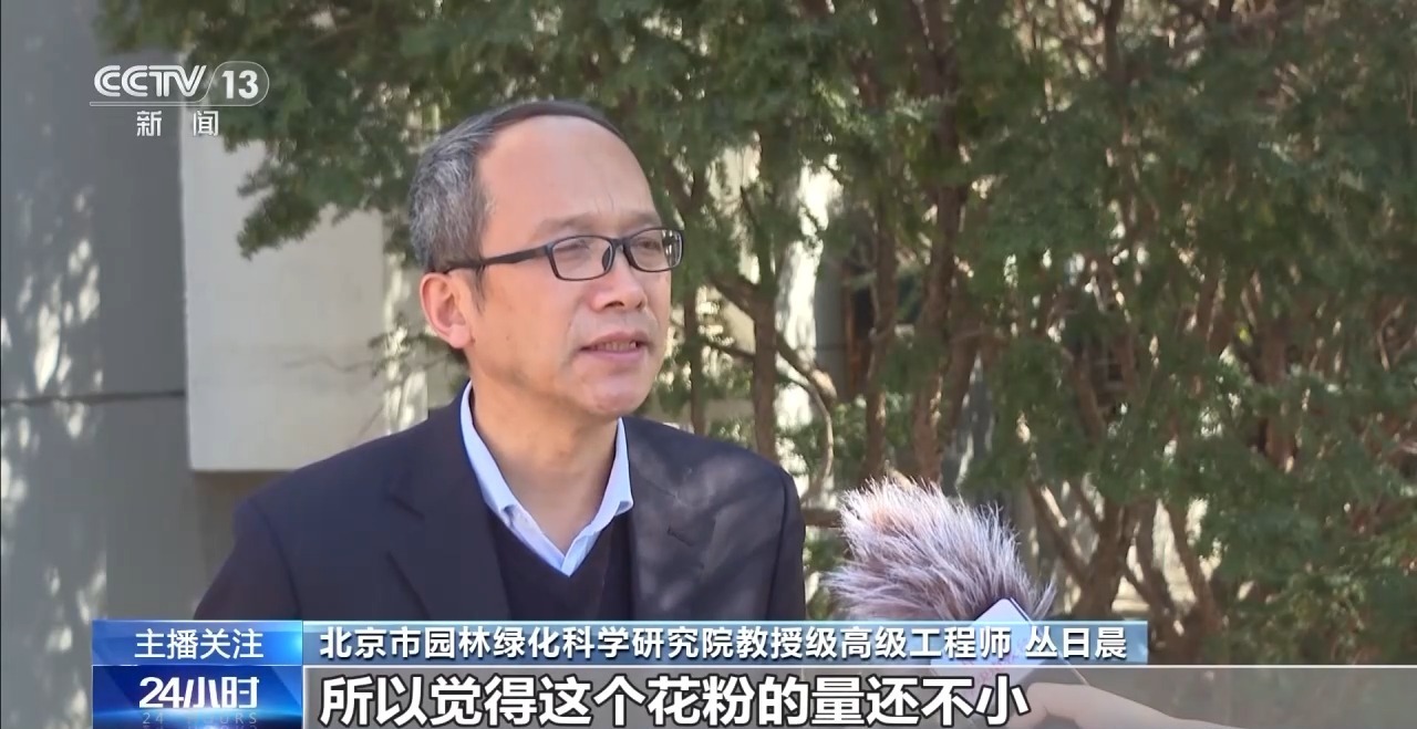 北京市园林绿化科学研究院教授级高级工程师 丛日晨:今年大家感觉花粉很多,从专业上理解,它今年可能是大年,这是第一个因素;第二个因素,这两天突然温度升高,花迅速成熟,雄花开放,然后花粉出来,另外就是受风的影响,花粉要靠风来传播,这几天大家也能感觉到,北京城市里是有风的,所以觉得这个花粉的量还不小。