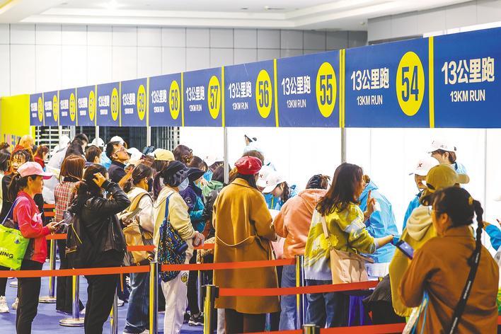 3月20日,武汉国际会展中心,汉马选手们进场领取参赛物品。(湖北日报全媒记者 倪娜 摄)