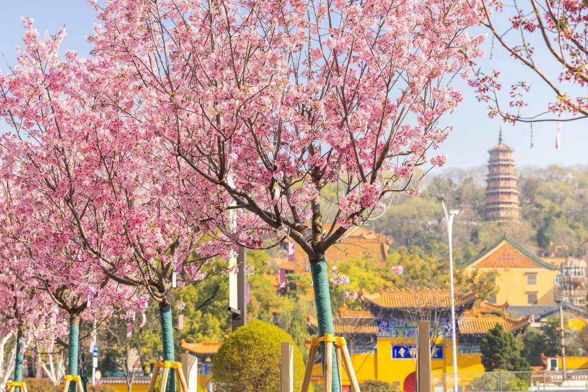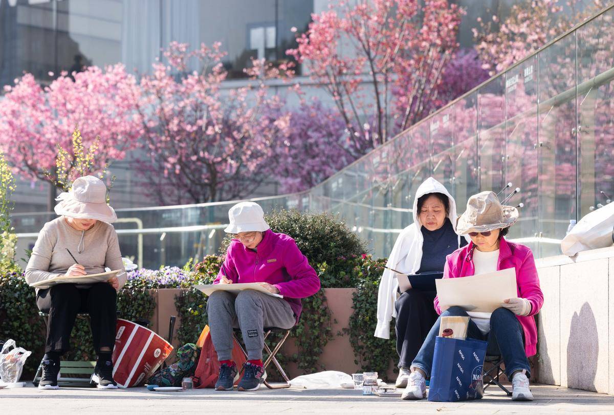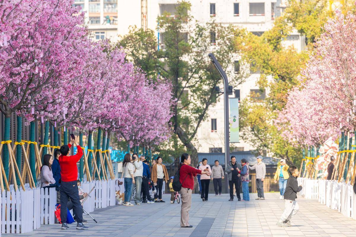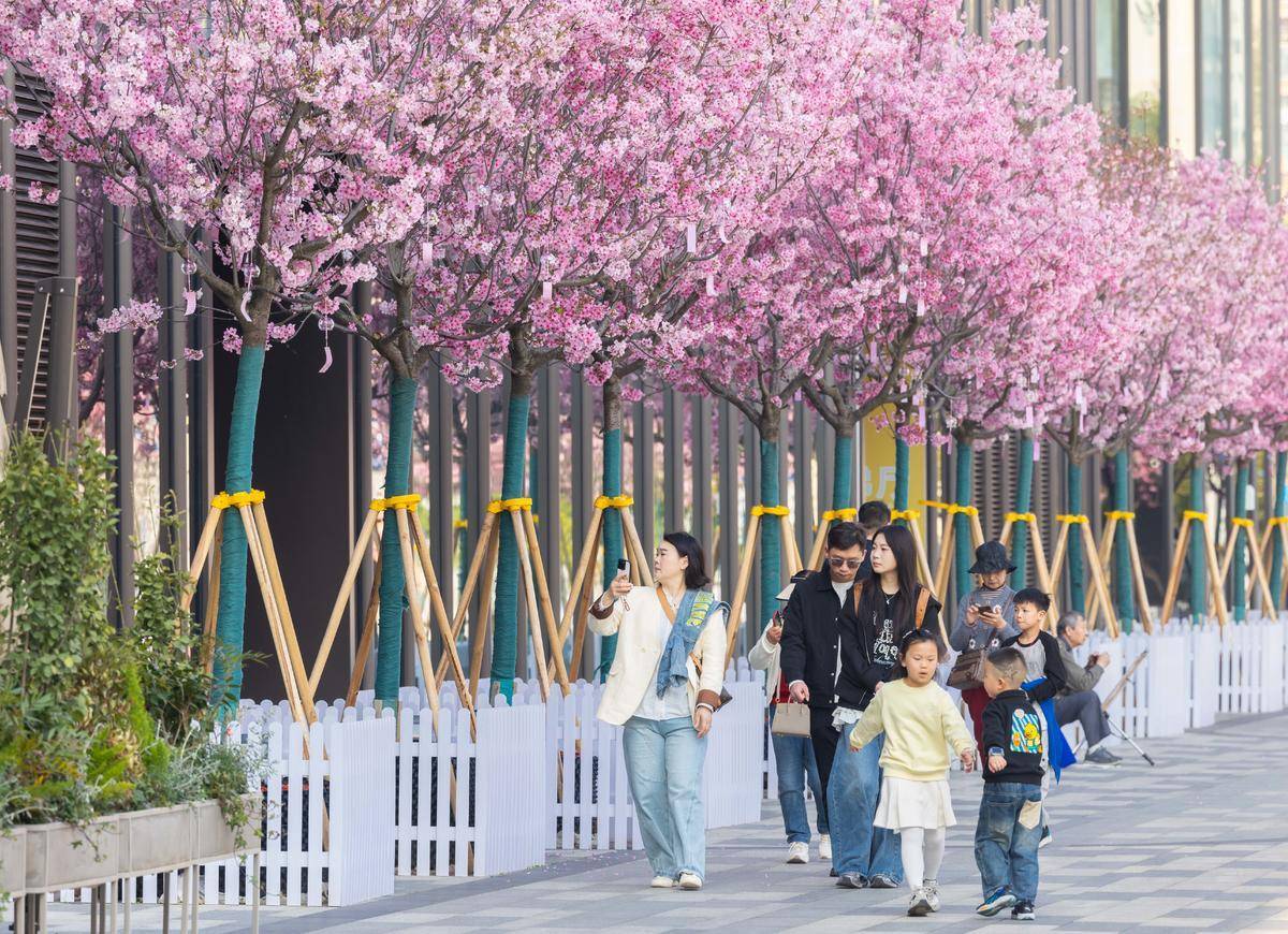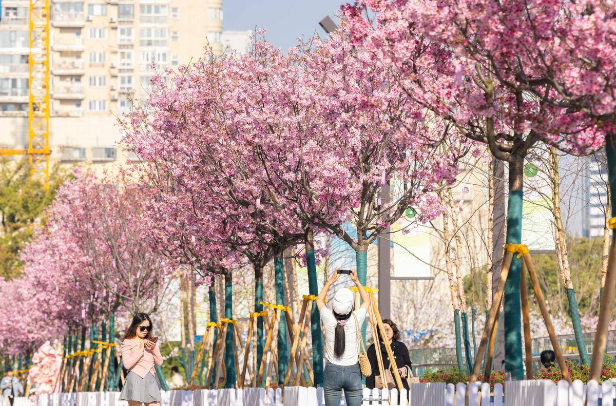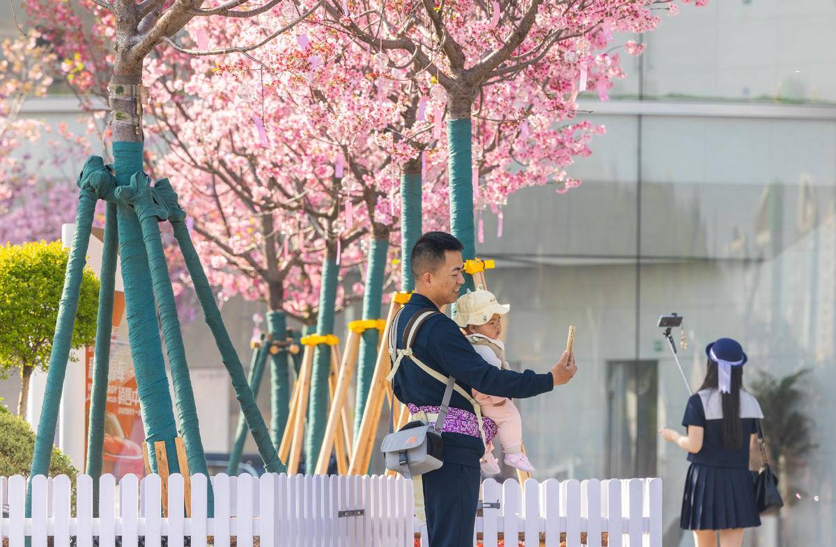 3月22日,武商梦时代广场前200多株樱花盛放,商场尚未到营业时间,门口已迎来大批游客赏花。(湖北日报全媒记者 薛婷 摄)