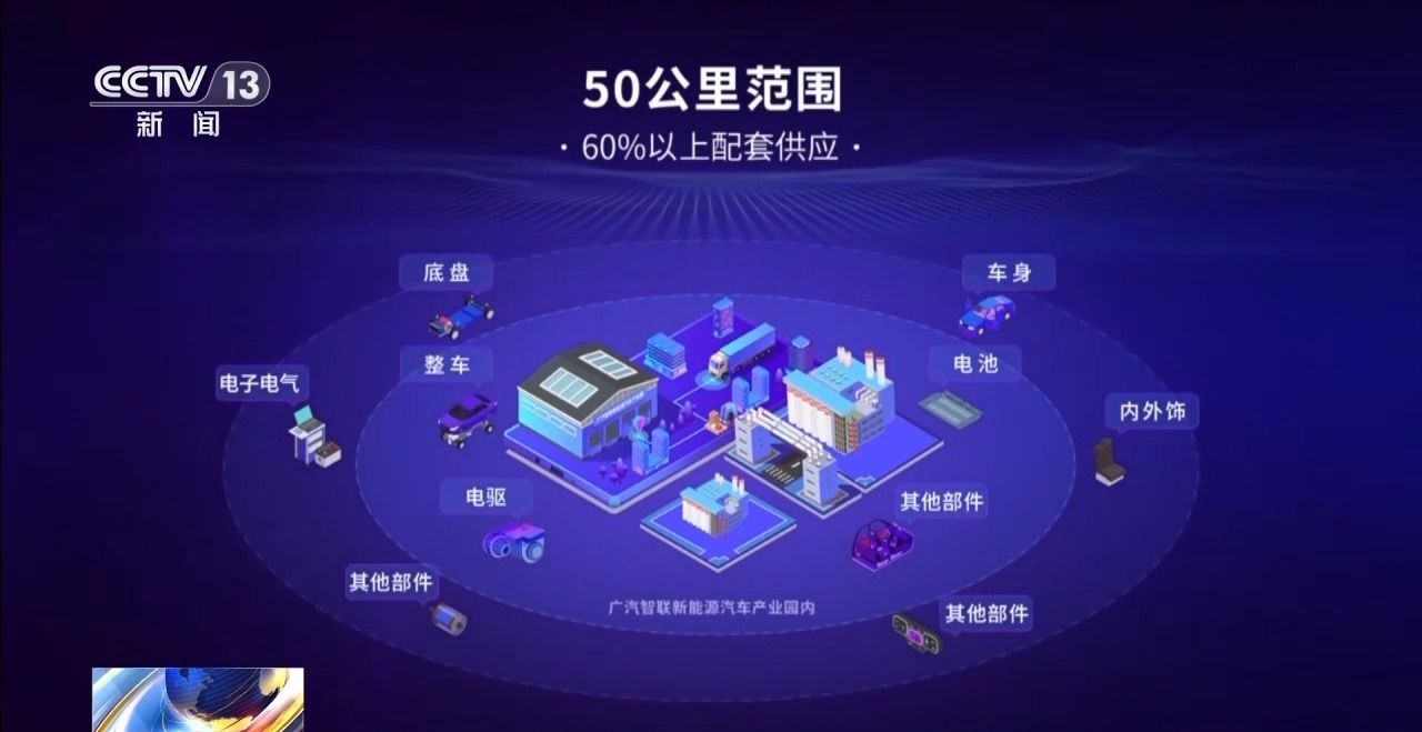 以智电汽车为牵引的产业生态圈持续扩大。一张以整车新能源工厂为中心的产业链生态图中,可以看到,在半径50公里的范围内,集聚了60%的供应商,而范围拓展至半径100公里时,80%的配套供应都可得到保障。