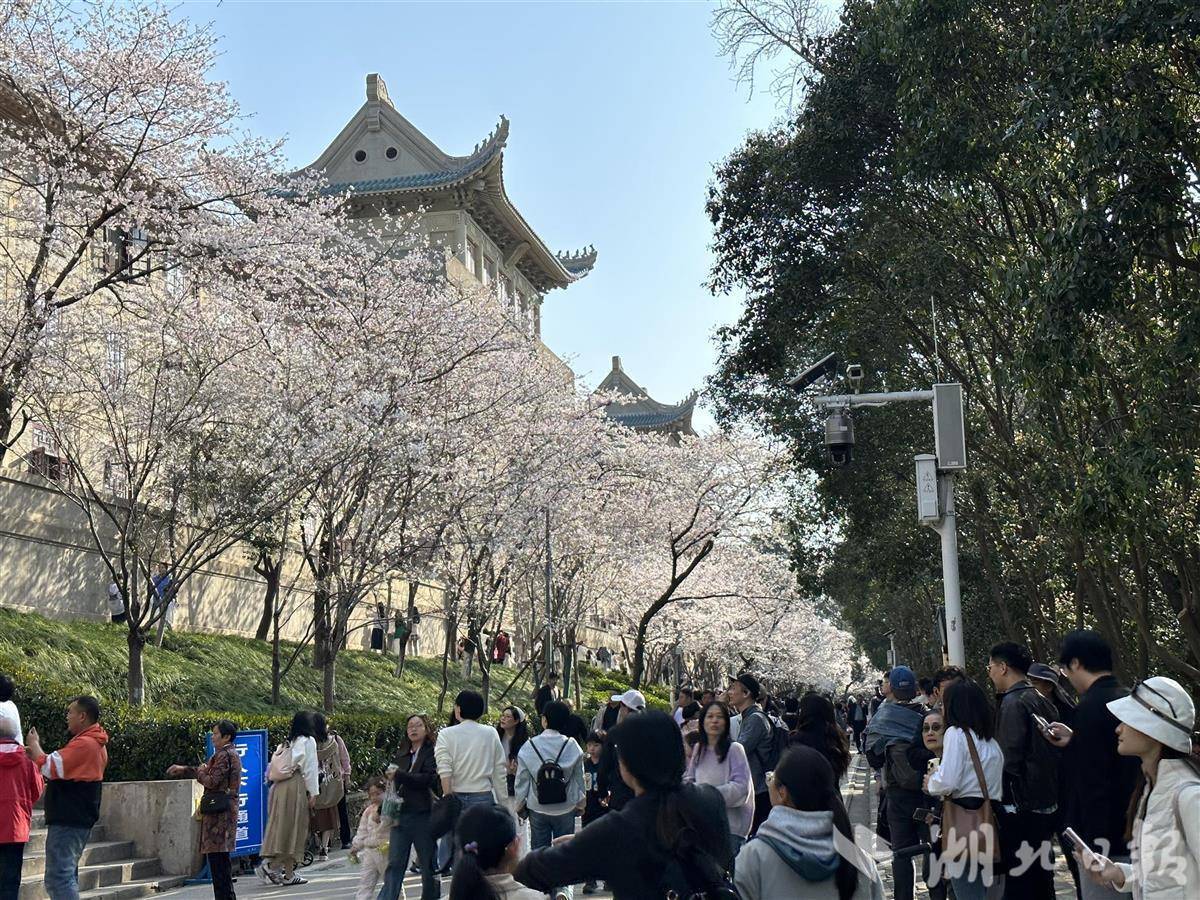走过百年老建筑老斋舍,樱花大道上升腾起粉色“云雾”,花瓣纷纷扬扬随风轻舞,与青色琉璃相映生辉,游客穿行其中,仿佛置身于云海,美不胜收。