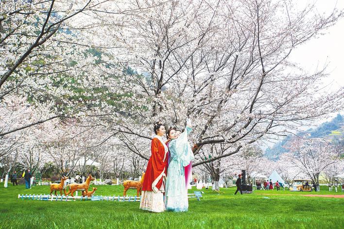 3月22日,身着汉服的游客在兴山朝天吼景区樱花园拍照打卡。(湖北日报全媒记者 李仁玺 通讯员 李阳 摄)
