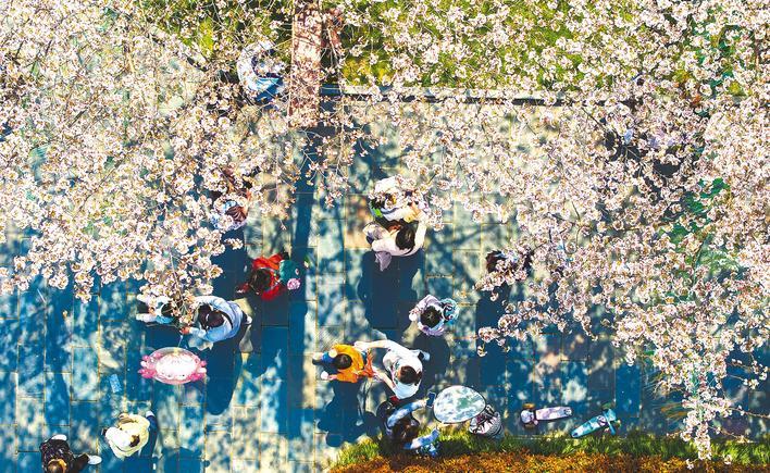 3月22日,武汉青山公园,游客在盛开的樱花下共享春光。(湖北日报全媒记者 柯皓 摄)