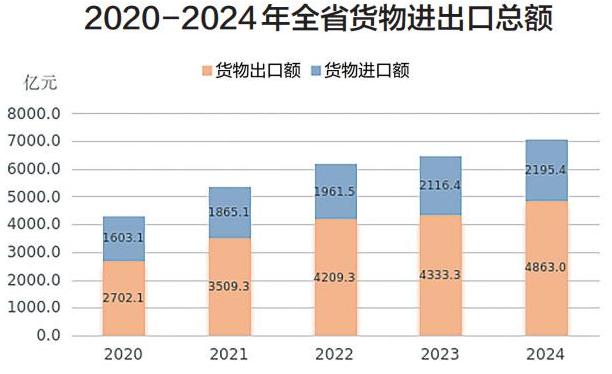 全年全省货物进出口总额7058.4亿元,比上年增长9.6%,其中,进口2195.4亿元,增长3.7%;出口4863.0亿元,增长12.4%。对前三大贸易伙伴东盟、欧盟、美国进出口额分别为1503.3亿元、810.8亿元、692.2亿元,增速分别为38.7%、-1.7%、12.1%。对RCEP成员国进出口额2298.2亿元,增长19.8%,占比为32.6%;对共建“一带一路”国家进出口额3760.0亿元,增长13.1%,占比为53.3%。