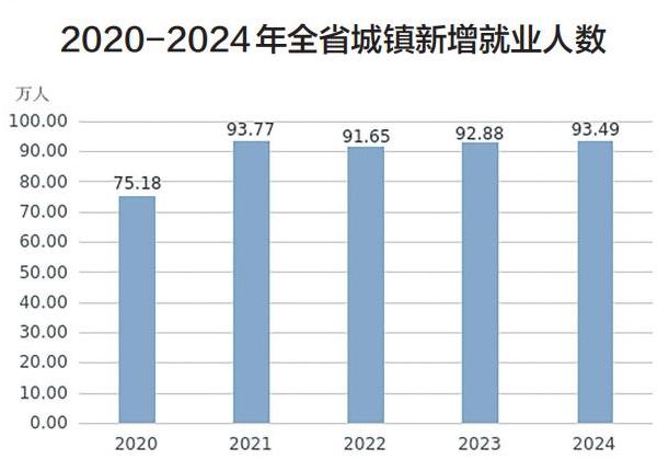 全年城镇新增就业93.49万人,超额完成全年目标任务。全省城镇调查失业率平均值为5.3%,比上年下降0.1个百分点。