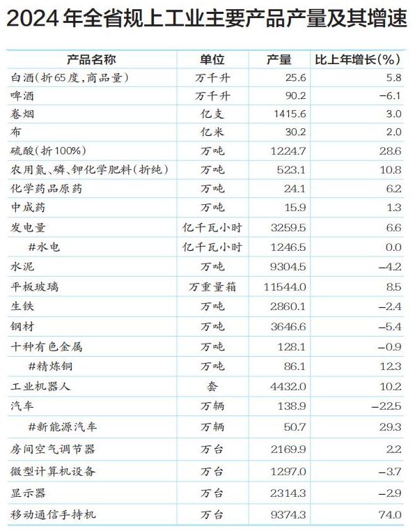 年末全省规模以上工业企业达到19916家。全年规模以上工业增加值比上年增长7.7%。分经济类型看,国有控股企业增长4.8%,股份制企业增长8.9%,外商及港澳台投资企业下降0.3%,私营企业增长6.4%。轻工业增长5.9%,重工业增长8.5%。分门类看,采矿业增长5.3%,制造业增长7.9%,电力、热力、燃气及水生产和供应业增长6.0%。