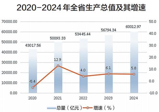 初步核算,2024年全省生产总值为60012.97亿元,按可比价格计算,比上年增长5.8%。其中,第一产业增加值5462.18亿元,增长3.1%;第二产业增加值21573.76亿元,增长6.4%;第三产业增加值32977.03亿元,增长5.9%。三次产业结构由2023年的8.9∶36.5∶54.6调整为9.1∶35.9∶55.0。全年人均地区生产总值为102832元,按可比价格计算,比上年增长5.9%。