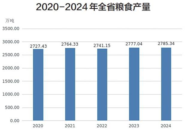 全年粮食产量2785.34万吨,比上年增长0.3%。谷物产量2624.90万吨,增长0.24%。其中,稻谷产量1889.25万吨,增长0.47%;小麦产量410.47万吨,增长0.01%;玉米产量315.24万吨,下降0.93%。大豆产量42.92万吨,增长0.26%。