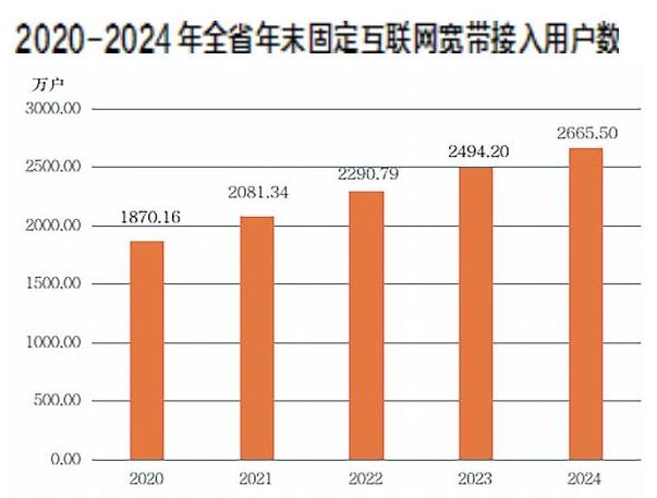 全年完成邮政行业业务总量641.73亿元,比上年增长29.7%。其中,快递业务量56.34亿件,快递业务收入375.13亿元。全年完成电信业务总量618.81亿元,增长13.6%。长途光缆线路长度达到3.75万公里;固定电话用户414.9万户;移动电话用户6523.3万户(不包含广电网络数据);移动电话普及率为113.0部/百人;固定互联网宽带接入用户2665.50万户,比上年增加171.30万户;移动互联网用户接入流量116.8亿GB,增长16.9%。