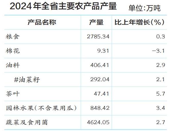 全年油料产量406.41万吨,比上年增长2.9%;茶叶产量47.41万吨,增长5.7%;园林水果产量848.42万吨,增长3.4%;蔬菜及食用菌产量4624.05万吨,增长2.7%。