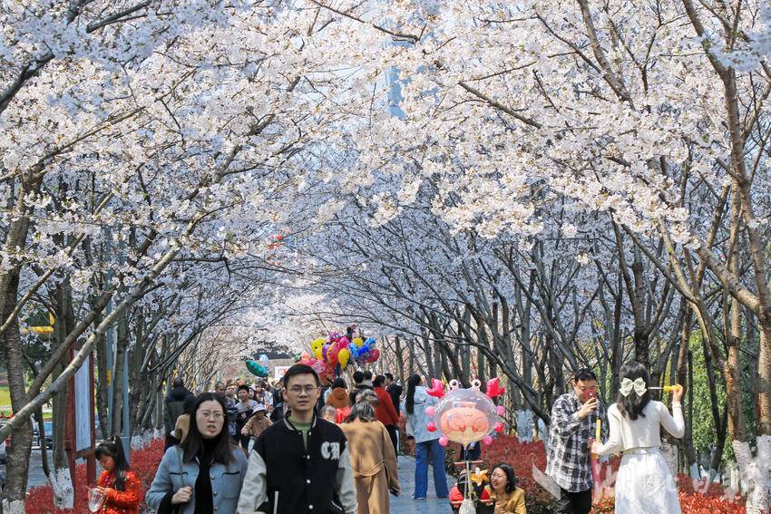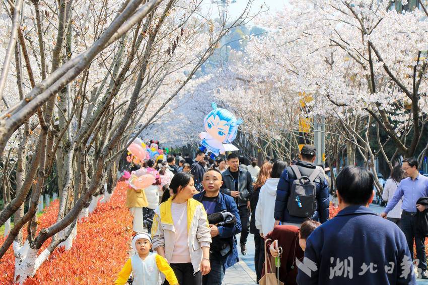 湖北日报客户端讯(通讯员 谭华)3月23日,人们在恩施市城区亲水走廊带状公园内欣赏樱花。