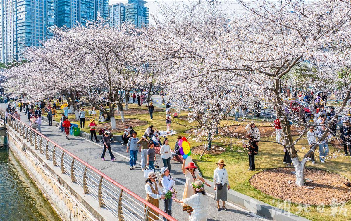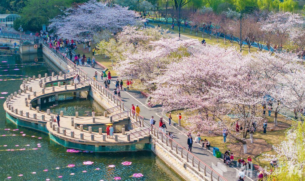 3月24日,武汉西北湖公园樱花进入盛花期,如云似霞,吸引众多游客拍照打卡。