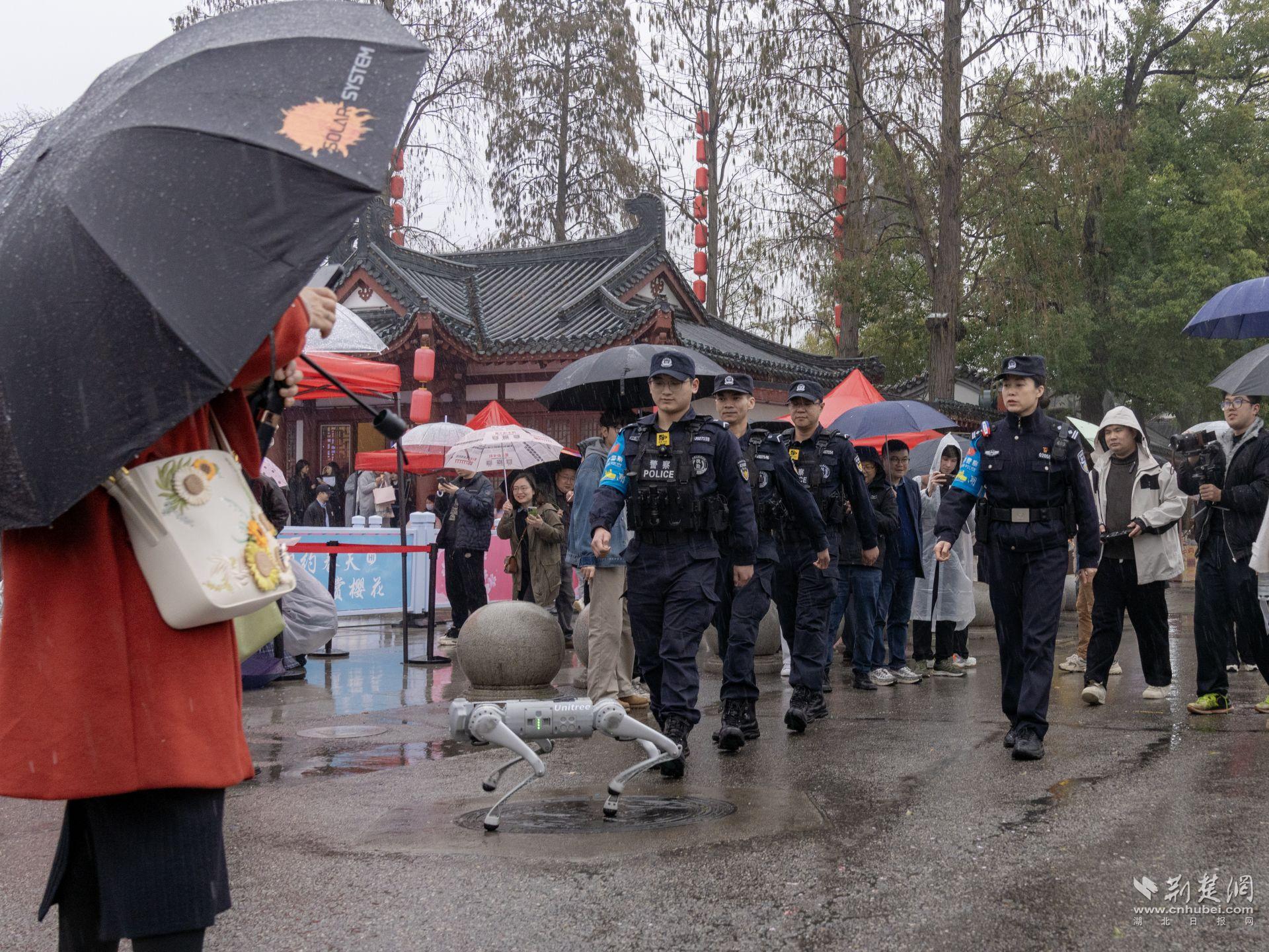 3月23日上午,东湖樱花园内,樱花如云似霞,游客如织。记者在现场看到,一架搭载高清摄像头和热成像仪的无人机在低空盘旋,实时监控着园内人流密集区域。与此同时,一台搭载高清摄像头的机器警犬正与民警一同巡逻,穿梭于游客之间,成为园区内一道独特的风景线。
