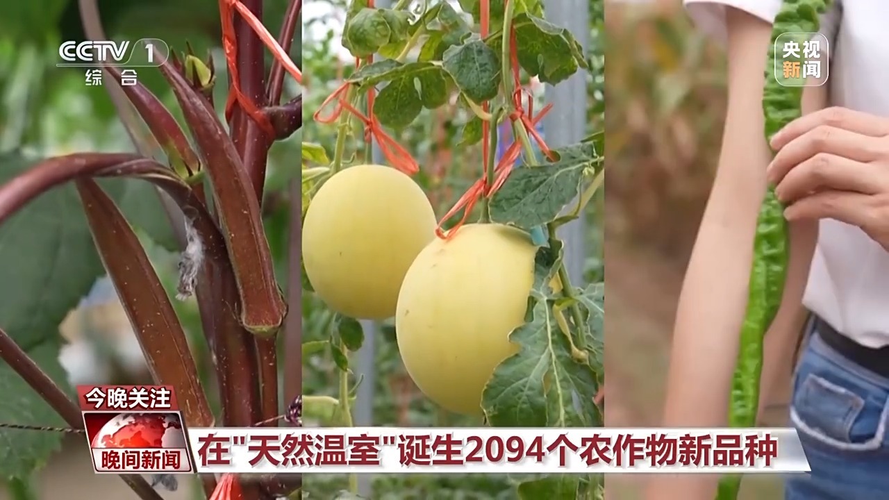 总台记者 黄珊:大家看,这是黑紫色的玉米,这边还有白色的玉米,花色的玉米,还有长度只有六七厘米的文玩玉米。在大棚里还有棕色的秋葵,挂藤式种植的黄皮西瓜,还有跟我手臂一样长的辣椒,就在这150多亩的种植基地里,一共有2094个农作物新品种,你见过的、没见过的瓜果蔬菜,在这里都能够找到。