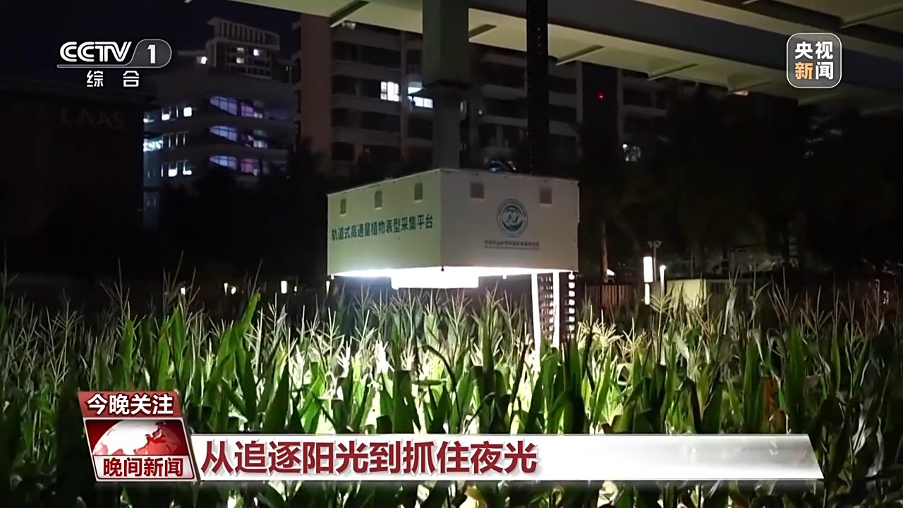 总台记者 黄珊:现在是晚上的十点多钟,周围已经是夜深人静了。但是在远处的稻田里,有一个发光的设备正在缓缓移动,这是一台作物表型采集平台,它就像扫描仪一样,可以沿着布设的轨道,采集植物的数据。