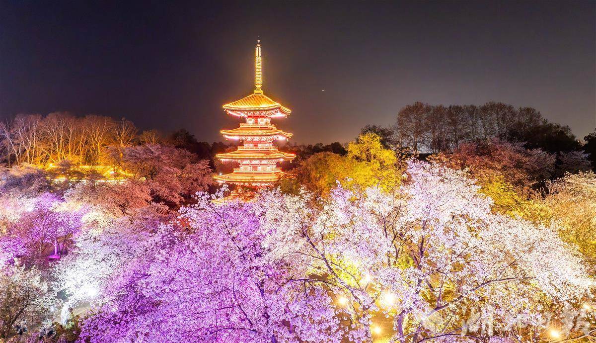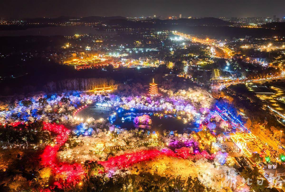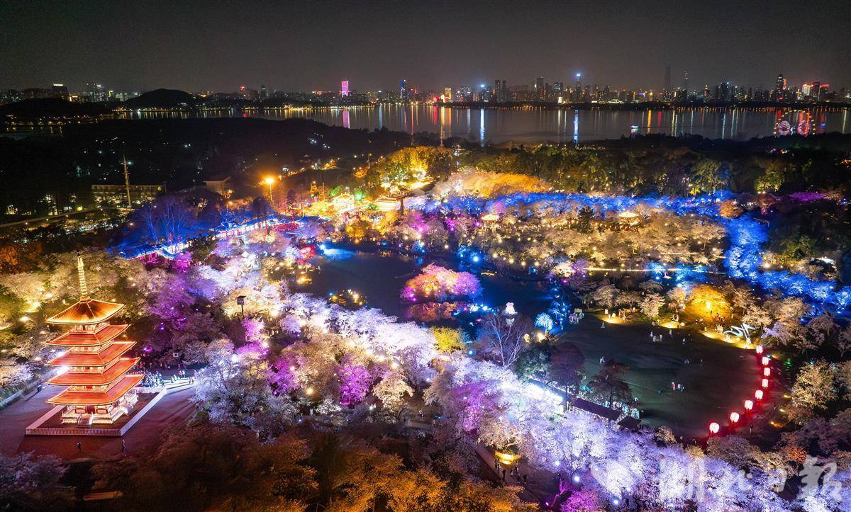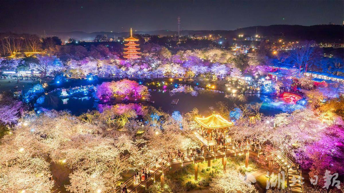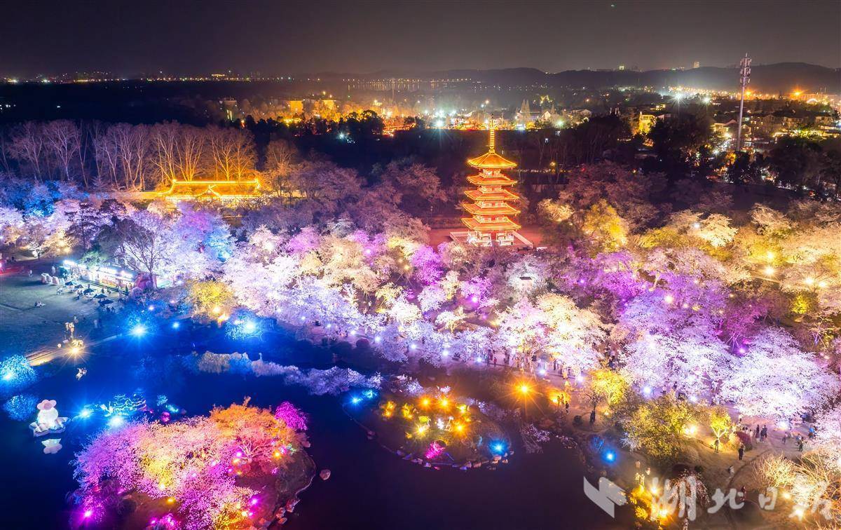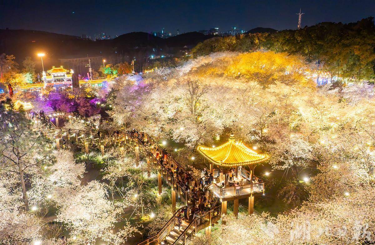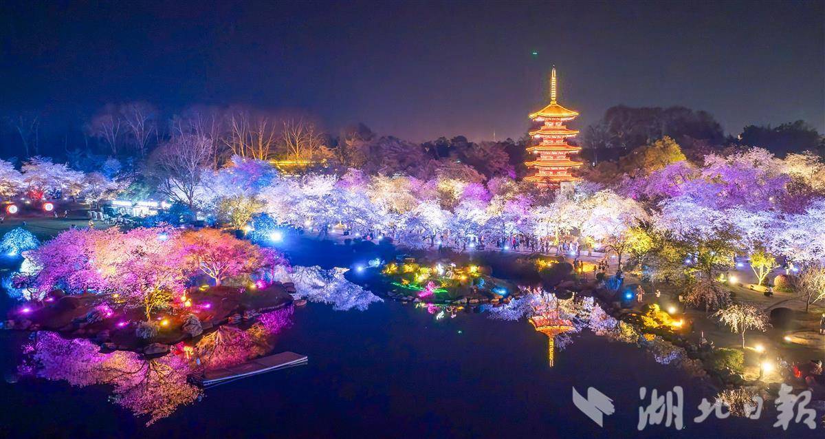 3月25日晚,武汉东湖樱园,万余株樱花在灯光映衬下如梦似幻,游客穿梭其中夜赏樱花。随着樱花进入盛花期,武汉夜樱在社交平台上火爆出圈,吸引各地游客组团打卡,感受武汉春天夜晚的浪漫。(湖北日报全媒记者 薛婷 摄)