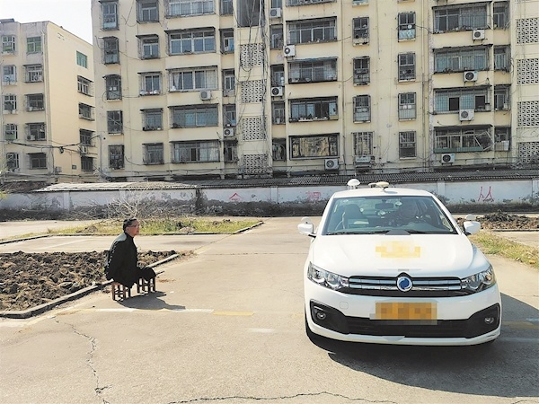 科目二训练场地上,学员驾驶着车辆练习倒车入库。一旁的褚明强一手撑着一个小板凳,缓慢移动着身体,时而大吼几声:“方向盘向右打死”“退的时候要慢”……