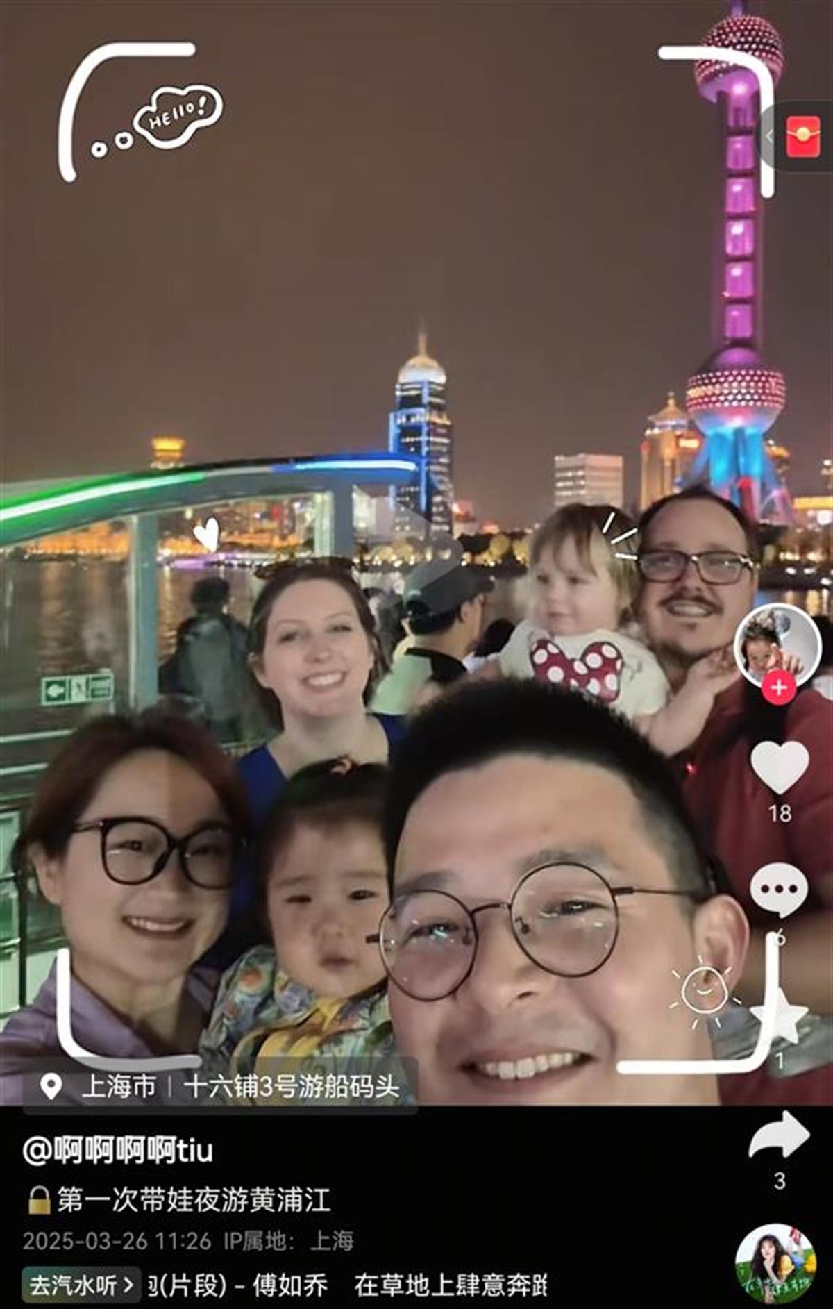 昨日,“啊啊啊啊tiu”又发布视频显示,他们带这个美国家庭乘坐游船夜游了黄浦江,领略了国际大都市的璀璨灯火。