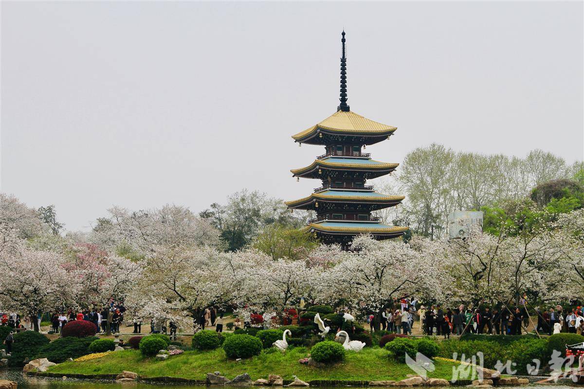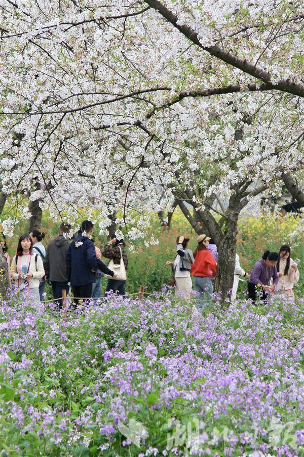 除了樱花外,东湖樱花园五重塔东面、丹麦花园处的黄色油菜花,经心书院南面的彩色油菜花,中央大草坪北面的虞美人,华莲池南面的垂丝海棠,以及浔樱花涧区域的雪柳等也正盛开,不同花海相互映衬,游览其中上下皆景。