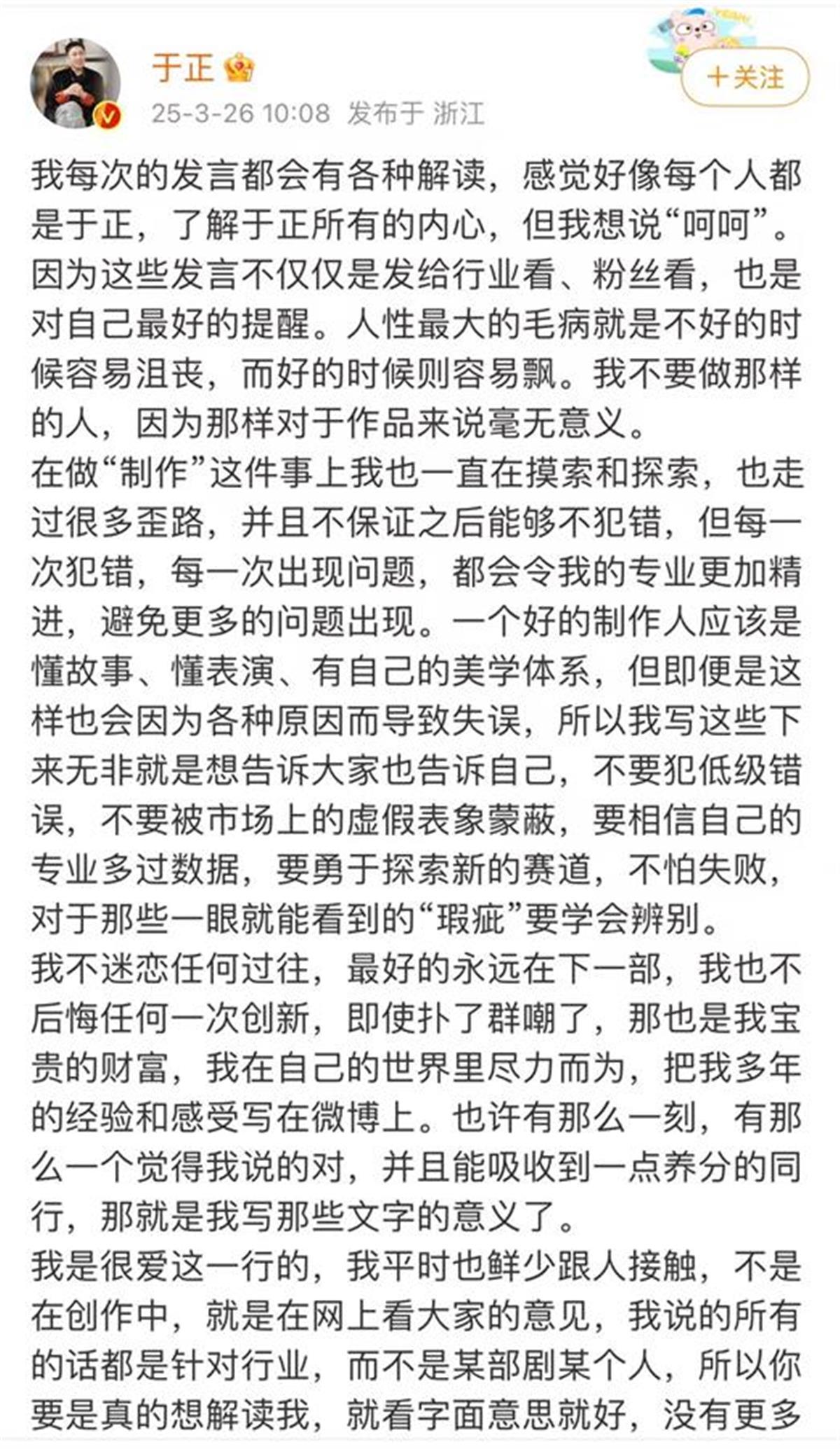 他表示,作为创作者就得有观点的表达,“公众认为大编剧、大制作人就应该保持沉默,但我不这样认为。我把自己当网友看,这样才能有个判断:这个剧会不会被观众喜欢?每个创作者都应该有观众视角,跟大众同频。”他还提到,自己在社交平台上很多表达都是戏谑和调侃,“但很多网友当真了。我不想用‘上位者’的视角俯看别人,用一种说教的口吻表达观点。所以有网友来骂我,我也会回骂,因为我们是一样的身份,大家都是网友。”