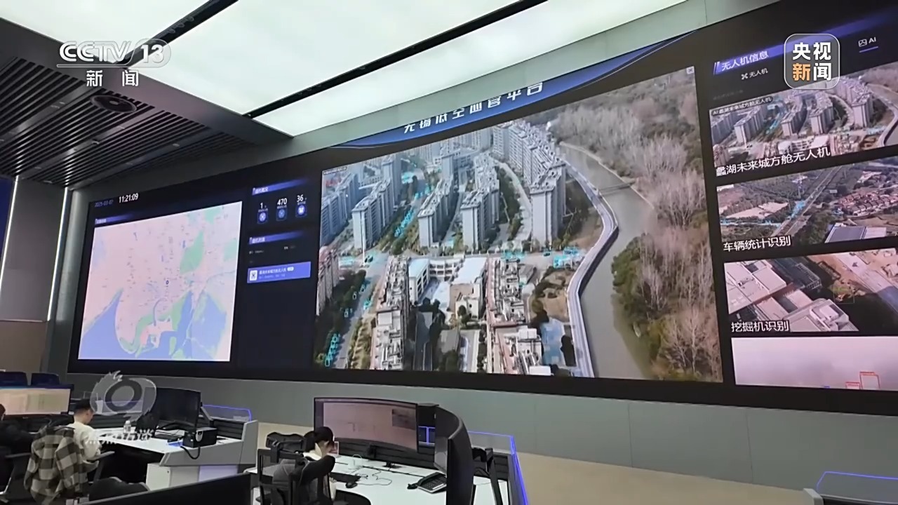 几公里外,在城市运行管理中心,无人机飞手已规划完成飞行路线、并远程遥控执守的无人机从指定地点起飞、执行飞行检查任务。几分钟后,无人机上的摄像头抓取到有关图像,在城运中心后台已经由人工智能自动生成了一份任务工单,经过人工审核,工单随即被推送至无锡市城管指挥中心。
