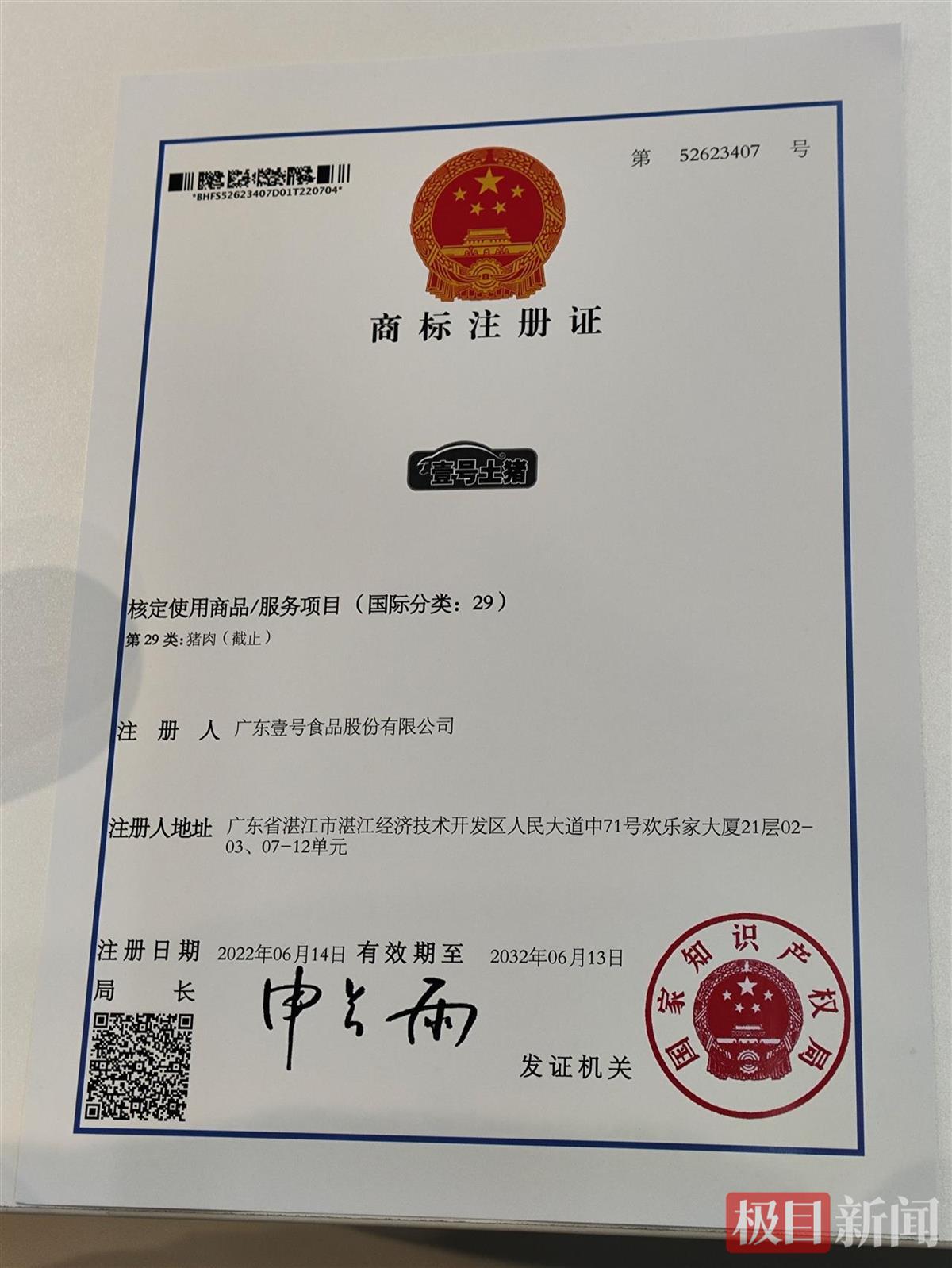 壹号食品公司向极目新闻记者出示的“商标注册证”显示,该商标的注册人地址位于广东湛江。3月27日,记者就此事咨询湛江市市场监管局,工作人员表示暂未关注到相关争议,将进行了解。