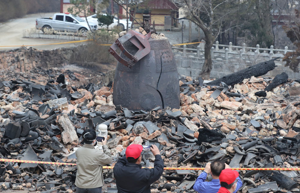 3月27日,在韩国庆尚北道义城郡,民众拍摄大火过后的古寺孤云寺废墟。新华社记者姚琪琳摄