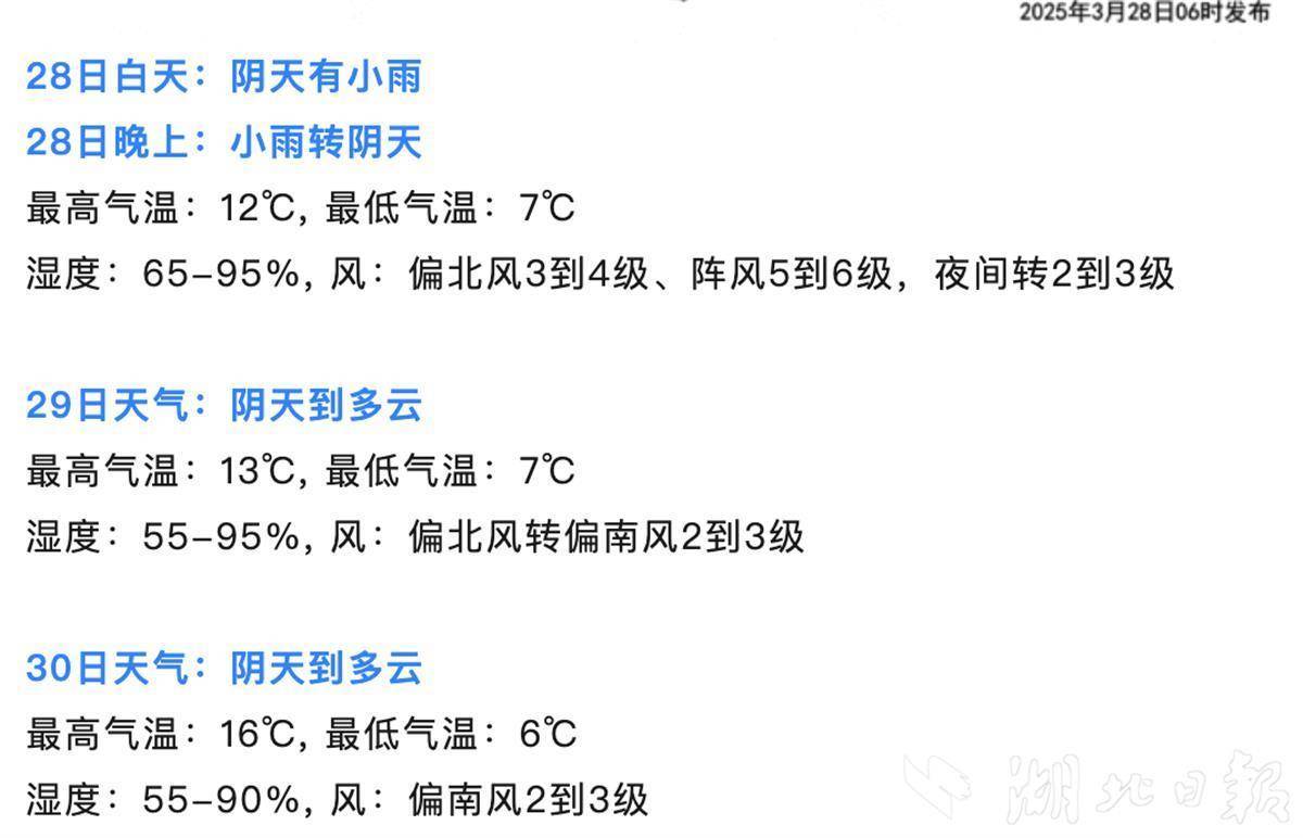 预计28日至30日全市平均气温9℃~11℃,将出现倒春寒,其中28日白天武汉市大风天气持续,有降水;31日起气温逐步上升。
